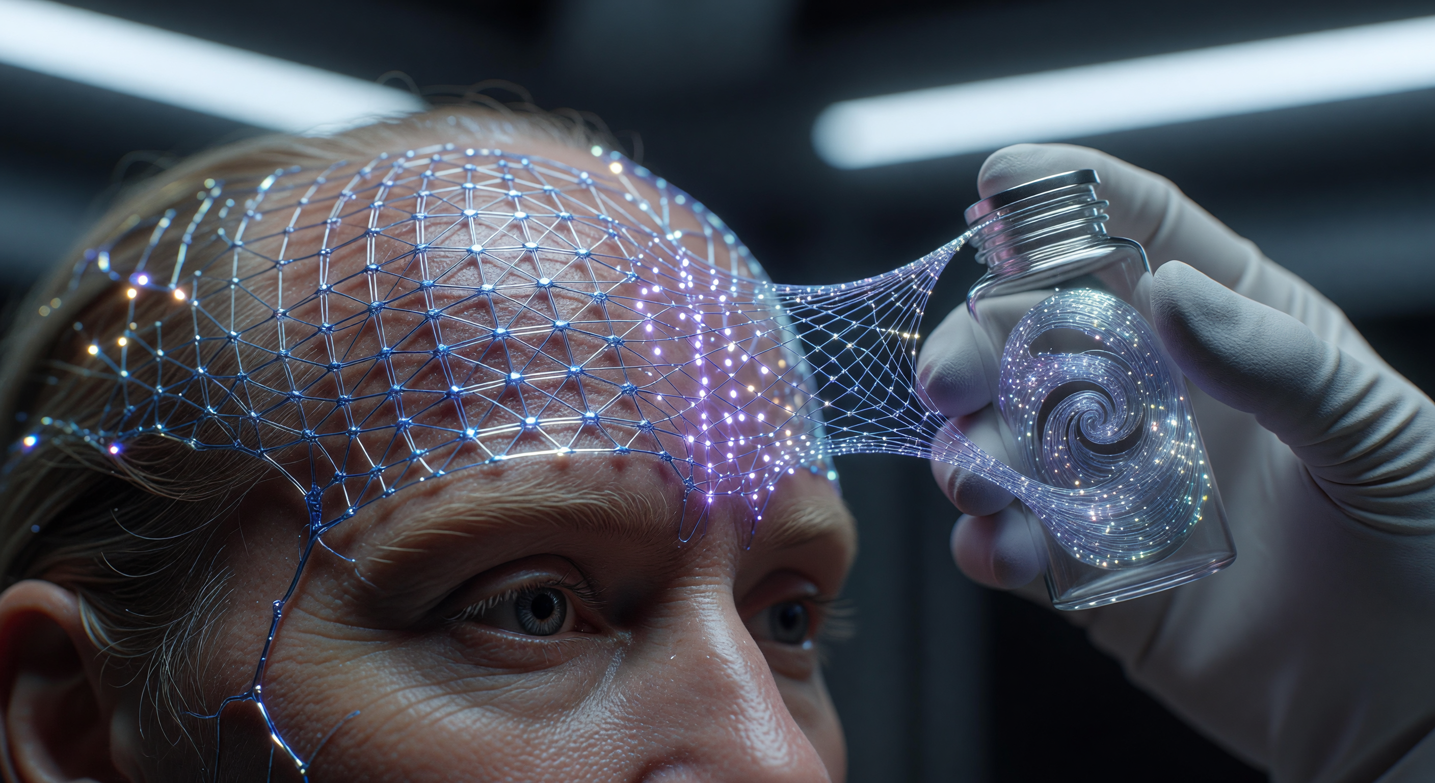The image is visually compelling and internally coherent as a depiction of a speculative future medical procedure: a luminous lattice-mesh network is being applied to or extracted from a human subject's forehead, with a gloved technician holding a glass vial containing a swirling, energized substance from which the mesh appears to emanate. The sterile clinical aesthetic (white gloves, cool overhead lighting, clean background) is appropriate for a 29th-century medical setting. However, as GPT noted, there are no environmental markers anchoring this to Ceres specifically — no low-gravity cues, no pressurized architecture, no asteroid-belt exterior, and no distinguishing physiological traits that would indicate a 'Ceres-born' individual. The cranium does not appear particularly elongated, and no reinforced vasculature is visible. The image works as a generic future biotech procedure but fails to evoke the specific Ceres Hub setting described in the caption.