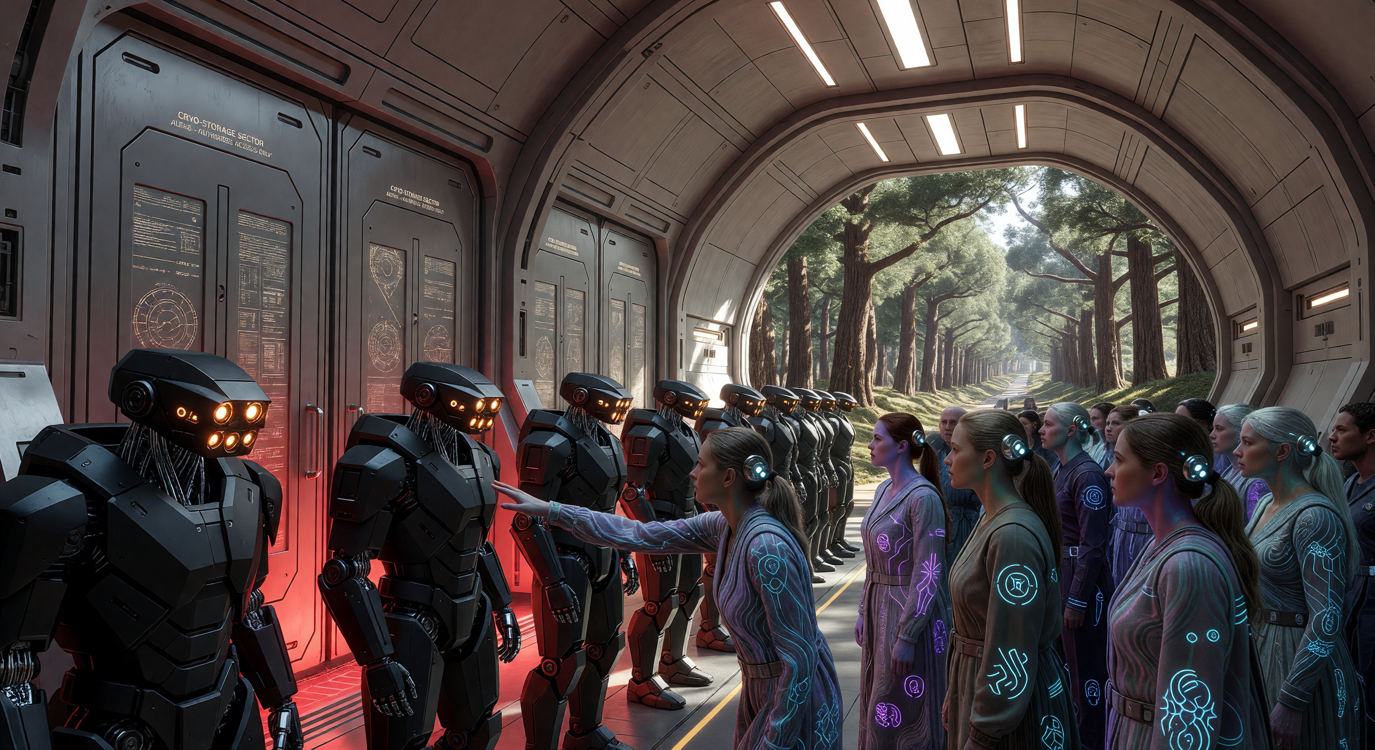 The committee broadly agrees that the scene is a coherent speculative-future interior: a curved generation-ship corridor, matte-black security synths, visible cryo-sector signage, and an engineered forest vista all fit the Solar Expansion / First Ship setting. Several reviewers also agreed that the human group’s glowing markings and neural headset-like devices effectively signal a distinct biologically/ culturally differentiated faction, and that the overall visual tension is well conveyed. The main disagreement concerned how much textual support the door signage provides; some reviewers considered it strong evidence for the cryo-sector framing, while others felt the more specific lore still goes beyond what can be directly verified in-frame.