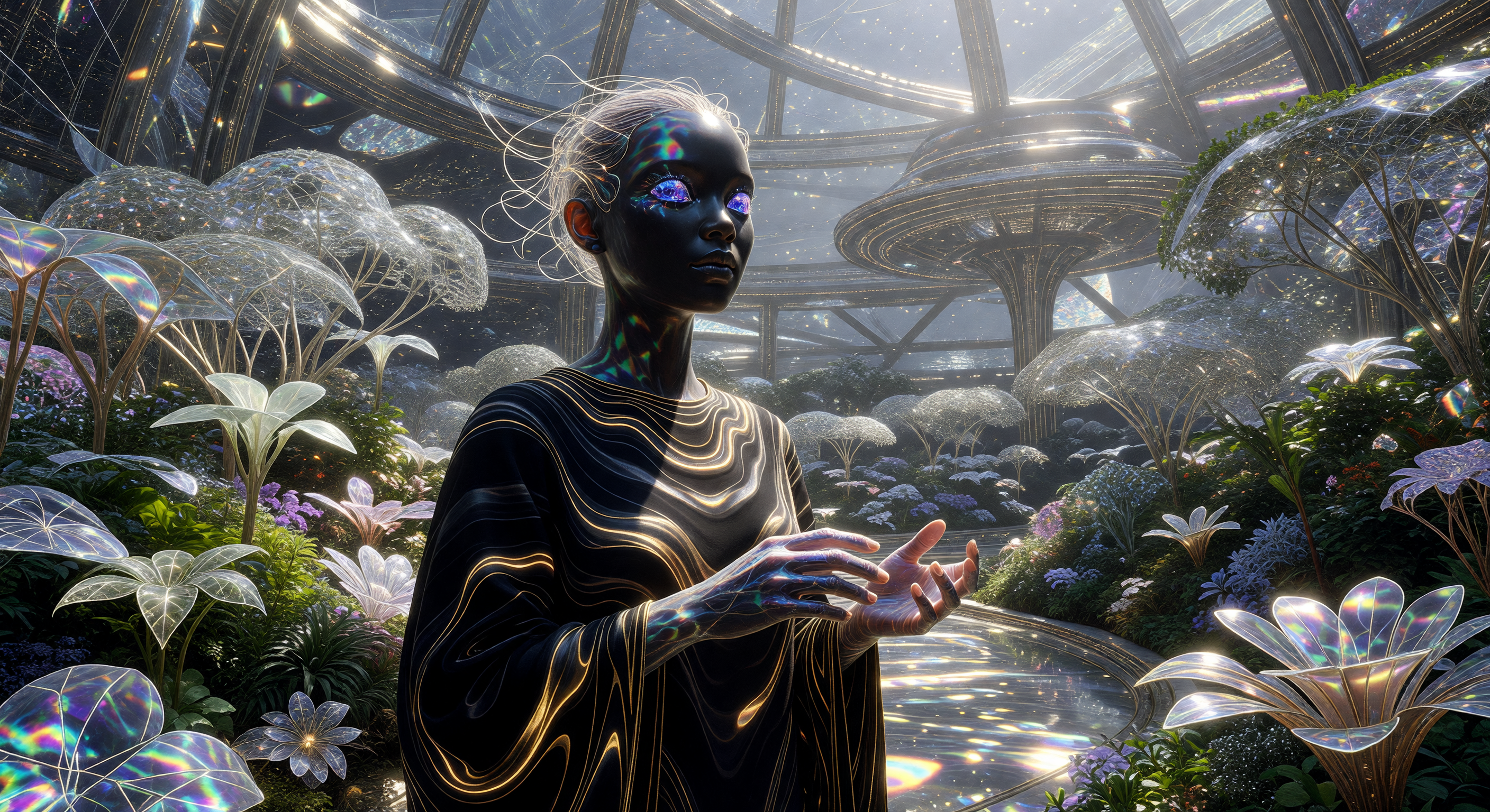 The image is visually compelling and largely cohesive for a far-future speculative period. The figure displays deep obsidian-like skin with iridescent highlights, luminous multi-colored eyes, and fine white neuro-filament-like tendrils in the hair — all consistent with the caption's description of 'Aurelian Symmetry' and post-biological augmentation. The garment is predominantly dark with glowing golden linear patterns, which reads as advanced fabrication, though notably it is NOT light-absorbing as the caption claims — the gold striations are clearly emissive/luminescent, contradicting the '99.9% light absorption' claim. The garden features translucent crystalline and iridescent flora of geometric design alongside more conventional-looking green plants, which partially fits 'Bio-Lace' flora but the mixing of ordinary-looking foliage with speculative flora is a mild inconsistency for a setting 100,000+ years in the future. The dome/megastructure ceiling is present but reads more as an advanced greenhouse or orbital habitat than a Dyson Shell specifically — scale cues are insufficient to distinguish this.