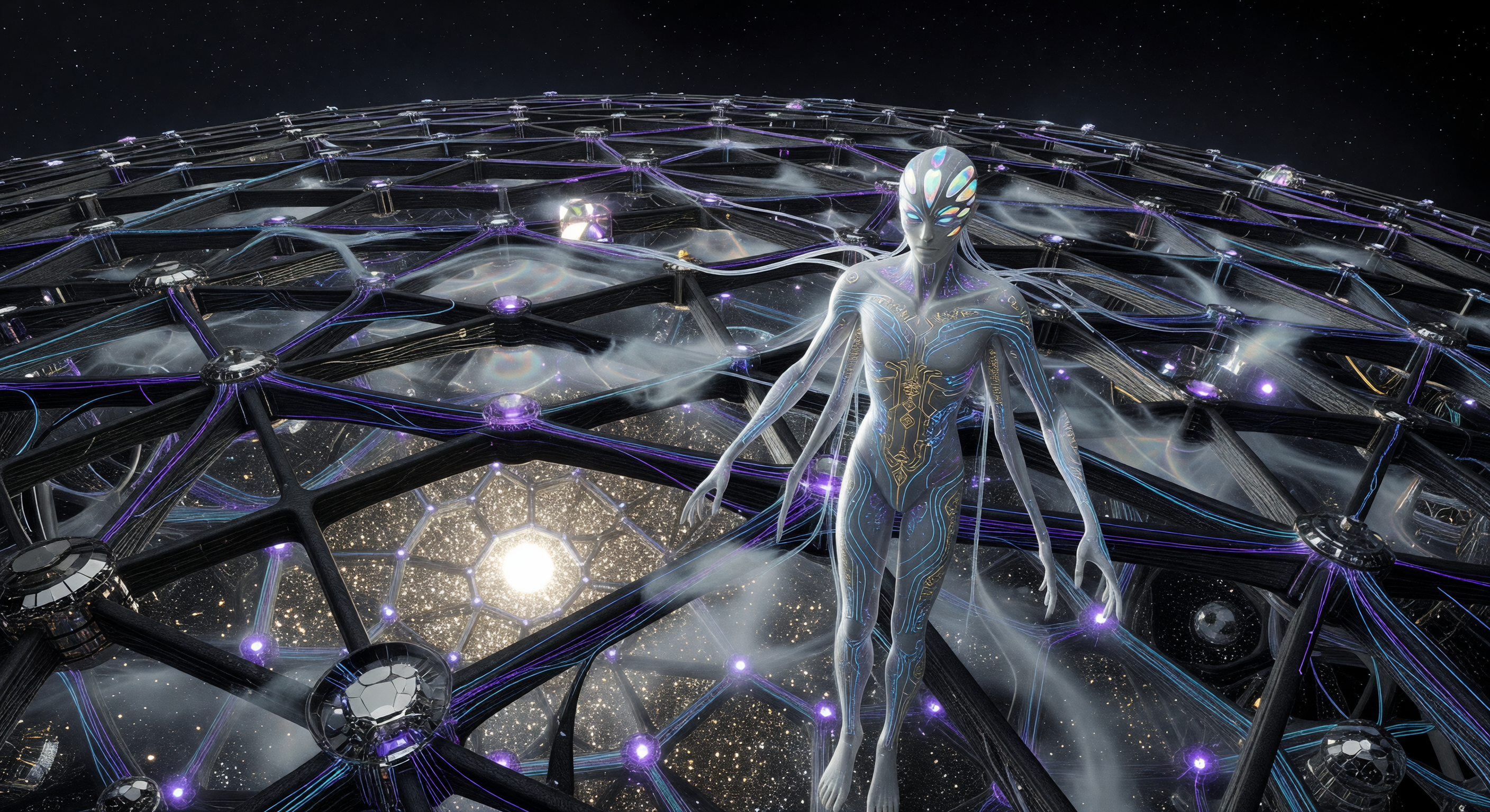 L’image saisit efficacement une mégastructure futuriste : un vaste réseau géodésique de sombres montants reliés par de fines filaments et nœuds violets luminescents, évoquant des architectures de nanotubes de carbone ou un câblage informatique. Un soleil central jaune est visible à travers une large ouverture, plausiblement pour représenter la source d’énergie stellaire exploitée, tandis qu’une brume blanche diffuse ajoute une atmosphère, suggérant des vapeurs cryogéniques ou des fluides de type « zéro‑g ». La figure post-humaine est bien conçue : membres allongés, peau irisée avec des marquages semblables à des circuits, et une forme cybernétique élégante, qui impliquent une adaptation biologique à la gravité nulle et à des améliorations post‑biologiques, en accord avec le transhumanisme spéculatif de l’ère du « Cosmic Maturity ». Toutefois, la pose de la figure—avec les pieds orientés vers le bas en direction du réseau et un léger accroupissement—indique une station sur une surface plutôt qu’une flottaison libre, ce qui contredit l’accent mis par la légende sur la « zéro‑g ». Le réseau ouvert où l’on voit aussi la lumière des étoiles ressemble davantage à un panneau de « Dyson swarm » ou à l’extérieur partiel d’une coquille qu’à une « couche intérieure de calcul » entièrement close d’une « Matrioshka Brain » emboîtée, introduisant de petites incohérences visuelles et nécessitant des ajustements rapides pour une enclosure véritablement intérieure et une lévitation non ambiguë.