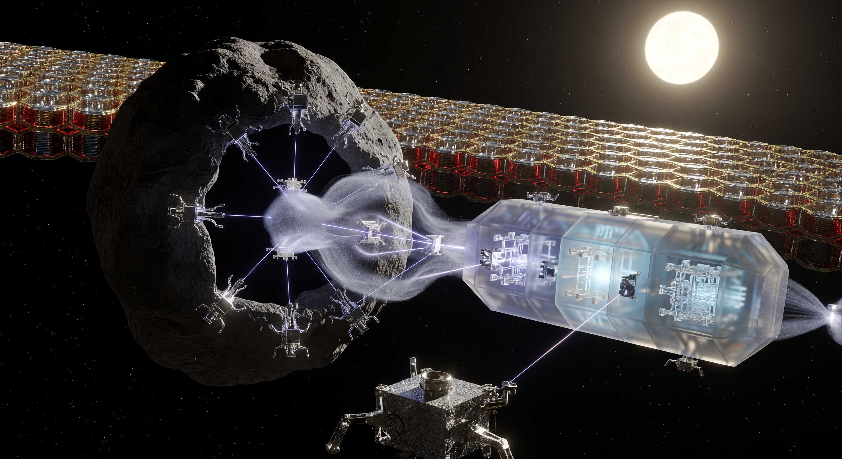 L’image saisit efficacement une scène spéculative de lointain futur d’ingénierie cosmique avancée, en accord avec l’ère de la Maturité Cosmique et la région des Contemplatifs. Les éléments clés incluent des sondes von Neumann de type araignée (structures métalliques, multi-membres, aux pattes articulées qui agrippent l’astéroïde) émettant des lasers/faisceaux bleus à haute énergie qui atomisent la surface rocheuse sombre, riche en carbone, produisant un nuage de vapeur ionisée visible. Ce nuage est canalisé par champs magnétiques (suggéré par l’écoulement dirigé et les champs de confinement) vers une forge centrale de type diamantzoïde—a structure translucide en réseau hexagonal, avec des nœuds computationnels lumineux et des substrats cristallins, évoquant une expansion de Matrioshka brain. L’ensemble de la composition est visuellement cohérent, avec une géologie d’astéroïde plausible (cratères, régolithe), une dynamique en microgravité et un arrière-plan étoilé où l’on distingue une lune/un autre astre lointain. Aucun anachronisme, inadéquation culturelle ou invraisemblance scientifique : la technologie évoque des civilisations d’IA indépendantes du substrat qui récoltent la masse du système solaire sous contraintes thermodynamiques.