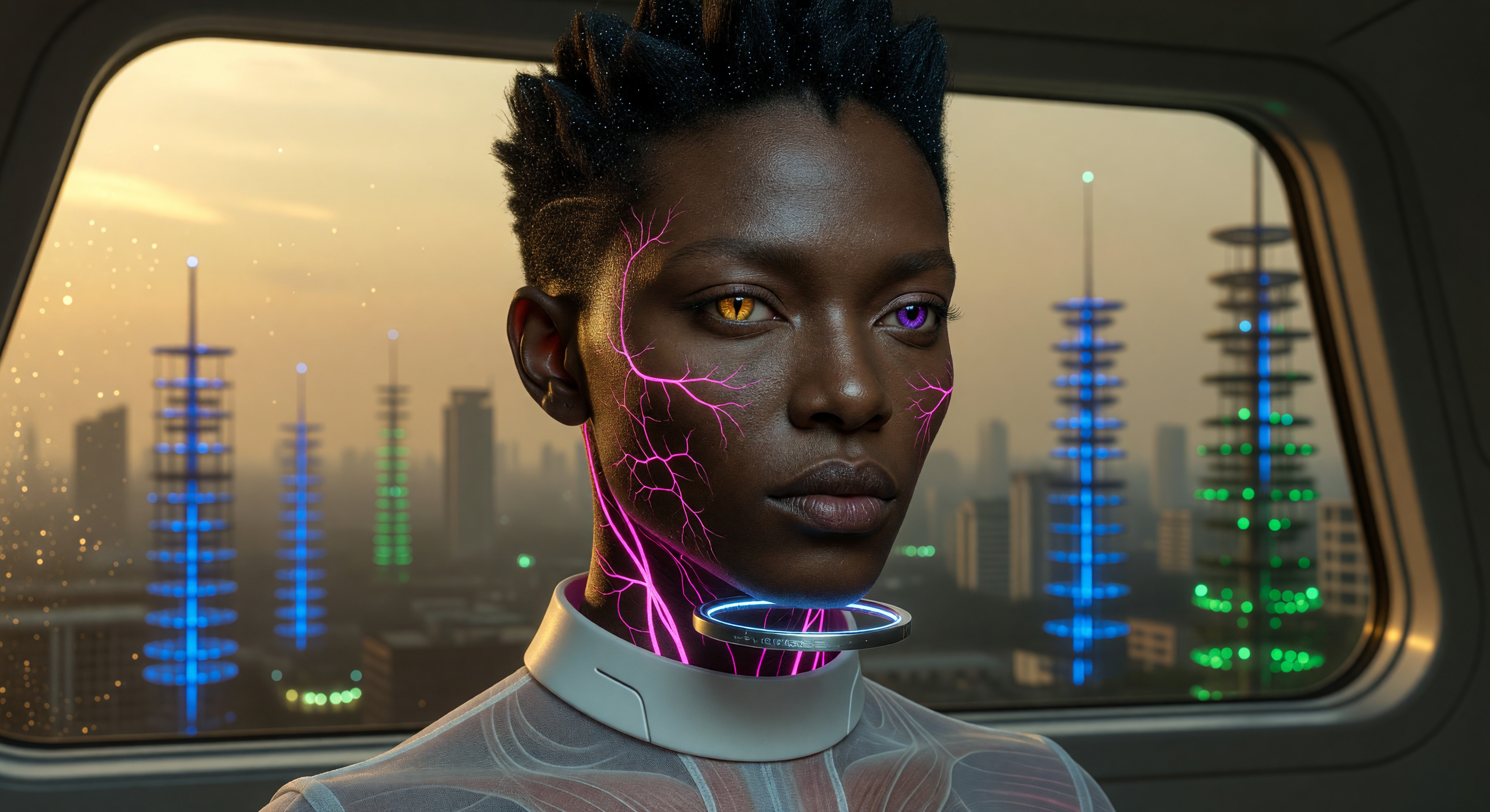 Image issues identified by the committee: 1) The hair does not clearly read as 'anti-gravity'; it appears as a styled, upward-textured natural hairstyle rather than a levitating or physics-defying form. 2) The collar does not clearly read as '4D-printed ceramic'; it looks more like a generic sleek smart collar/neckpiece or composite/plastic material, not identifiable ceramic. 3) GPT noted that the image does not clearly show bio-engineered ocular modifications distinct from general colored/glowing eyes; the eye effect is present but specific implantation/modification is not visually verifiable. 4) GPT also noted there are no obvious heartbeat cues showing the glowing markings pulsing in synchrony with cardiovascular rhythm. 5) GPT further questioned whether the luminous markings are clearly subdermal luciferase tattoos versus generic electronic or AR-like glow. 6) While not framed as an error, Claude and Gemini both treated the hair and collar as needing refinement for stronger visual correspondence to the caption.