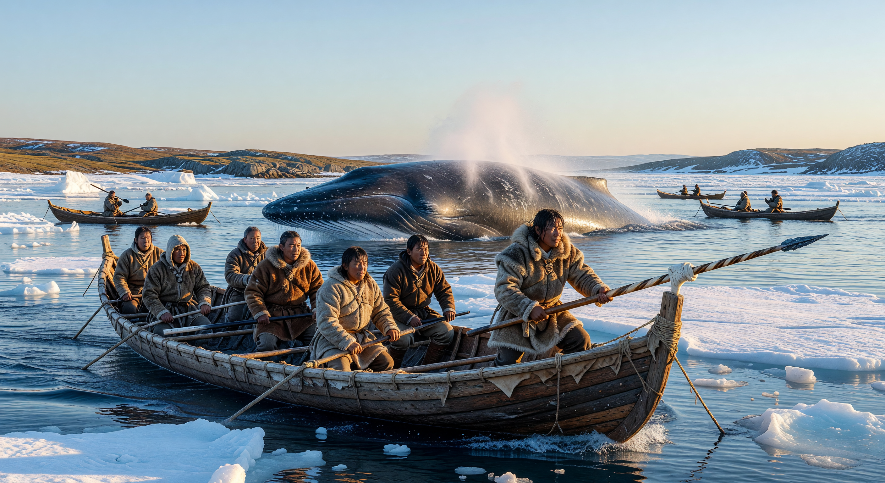 Vers le XIIIe siècle, dans les eaux glacées de l'Arctique canadien, des chasseurs thuléens — ancêtres des Inuits — s'approchent d'une baleine boréale à bord d'un *umiak*, une embarcation robuste faite de peaux de morse tendues sur une armature en bois de grève. Armés de harpons à tête basculante sculptés dans l'ivoire et le chert, ces navigateurs d'élite coordonnent leurs efforts pour assurer la subsistance de leur communauté face à un environnement extrême. Cette scène illustre la maîtrise technologique et la bravoure de ce peuple migrateur, dont l'économie maritime sophistiquée a permis l'expansion à travers le Grand Nord, du détroit de Béring jusqu'au Groenland.