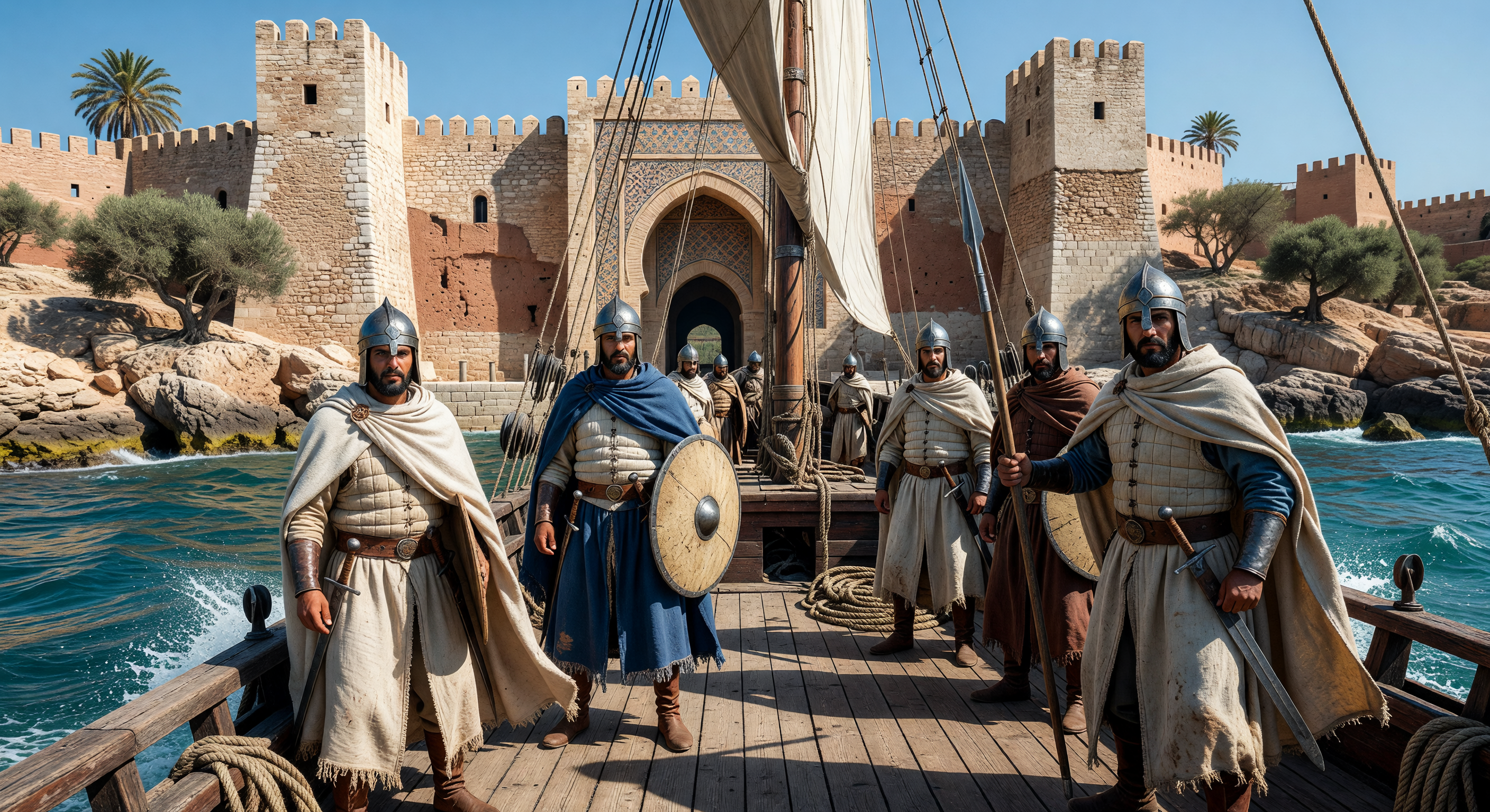 Vote rationale: the scene’s overall geography and architectural motif are directionally consistent with the region and era, so a full redo isn’t necessary. But because (1) the soldiers’ equipment and shield type are not clearly evidenced visually, and (2) the caption makes specific historical assertions that the image does not substantiate, this should be adjusted—either by refining the prompt to better match known Almohad military/artifact specifics or by toning the caption to more general, defensible statements (e.g., “Maghrebi Muslim naval patrol” rather than detailed *daraqa* and route-dominance claims).