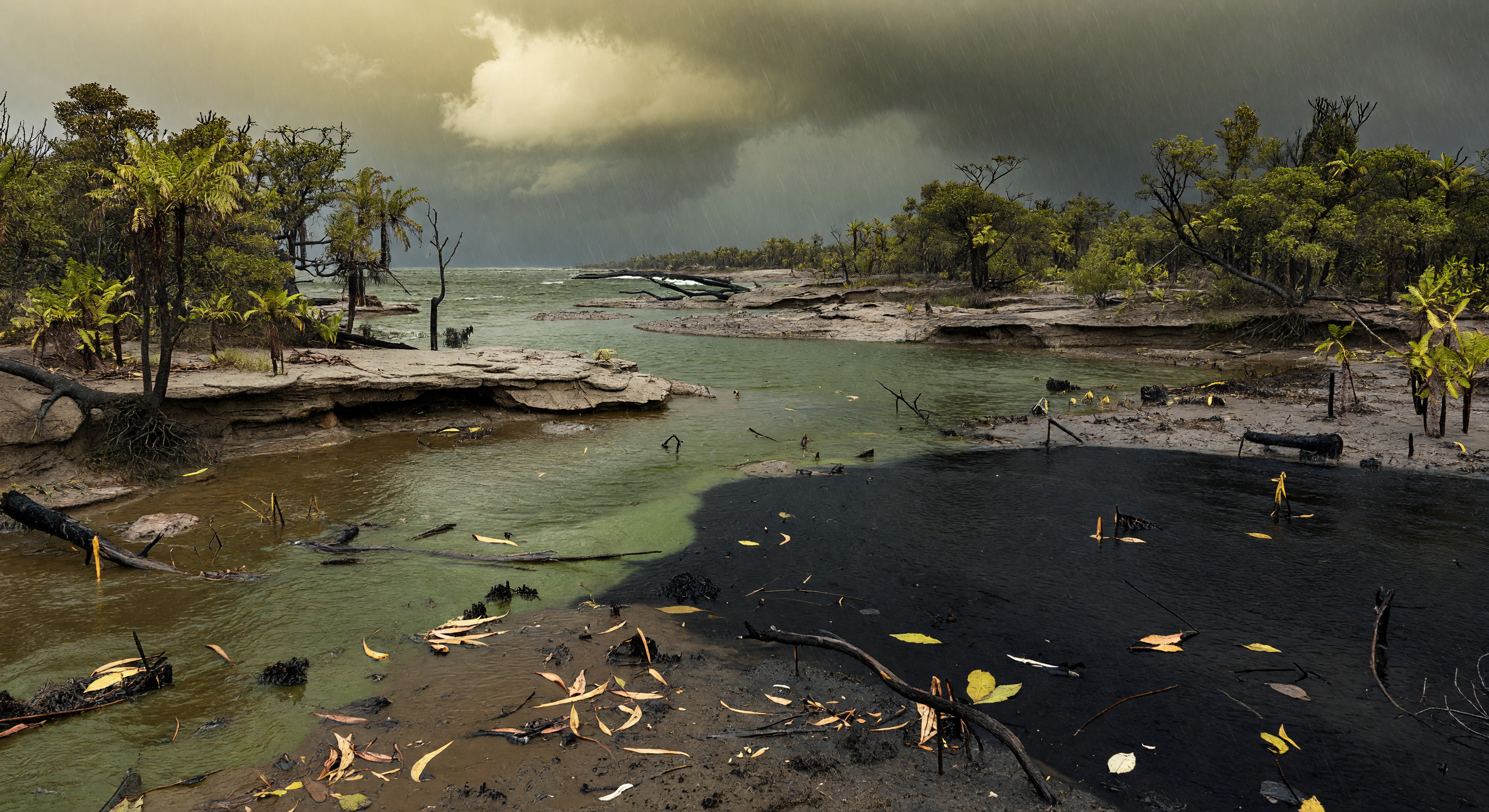 Sous un ciel jaune gris chargé d’aérosols, cette côte estuarienne du Gondwana austral montre les dernières heures du Permien, il y a environ 252 millions d’années, lorsque la crise de la « Grande Mort » ravagea même les hautes latitudes polaires. La pluie acide fouette des boisements de Glossopteris en train de dépérir, tandis que des eaux boueuses chargées de cendres, de charbon et de débris végétaux entraînent troncs calcinés et feuilles arrachées vers une mer littorale verdâtre en surface, mais noire et appauvrie en oxygène en profondeur. Parmi les vasières et les berges de grès et de silt, un discret tétrapode comme un petit temnospondyle ou un dicynodonte rappelle que l’effondrement touchait à la fois les forêts, les rivières et les écosystèmes marins.