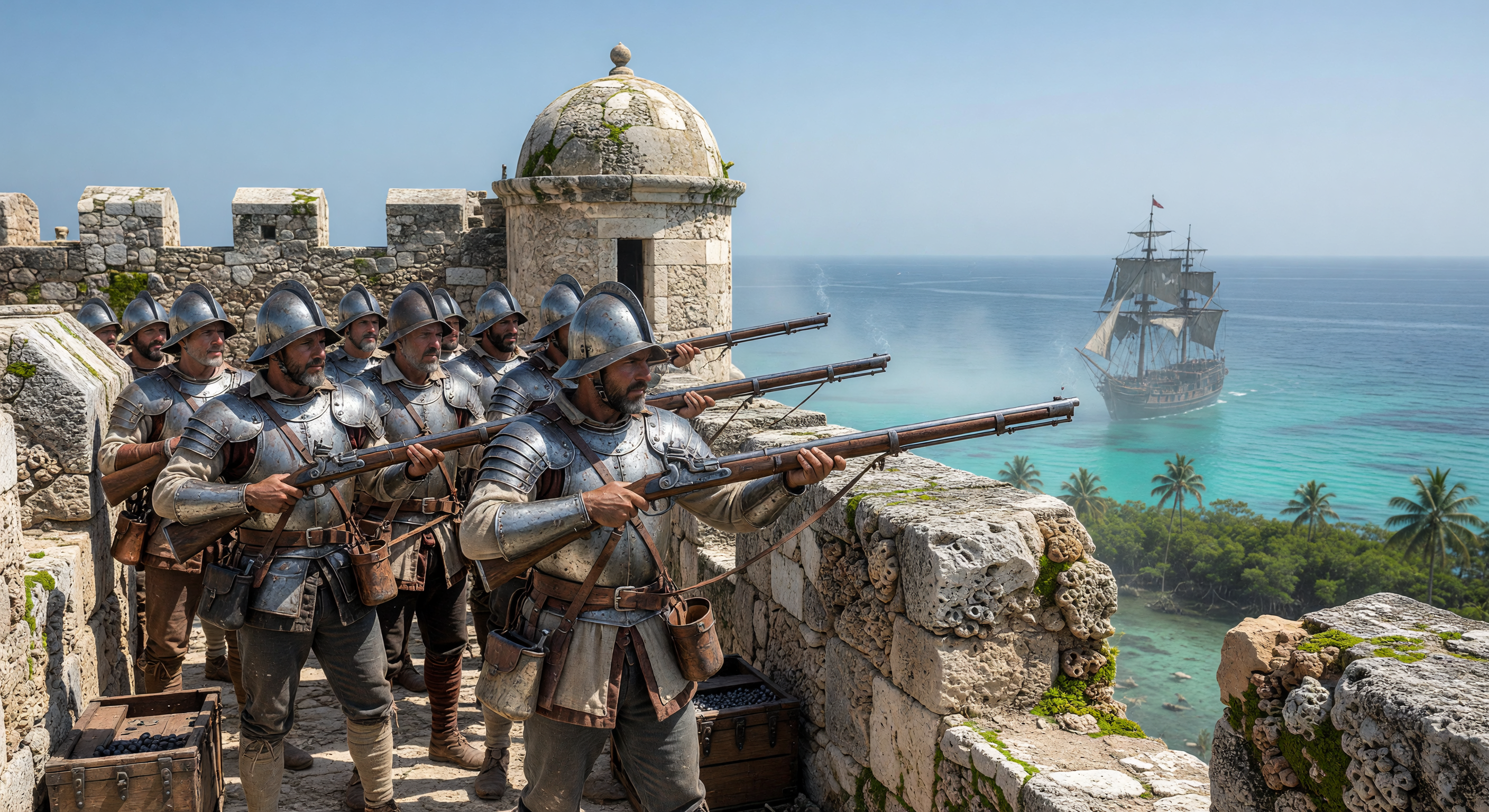 - 日本語: カリブ海の要塞の城壁を守るスペインの火縄銃兵