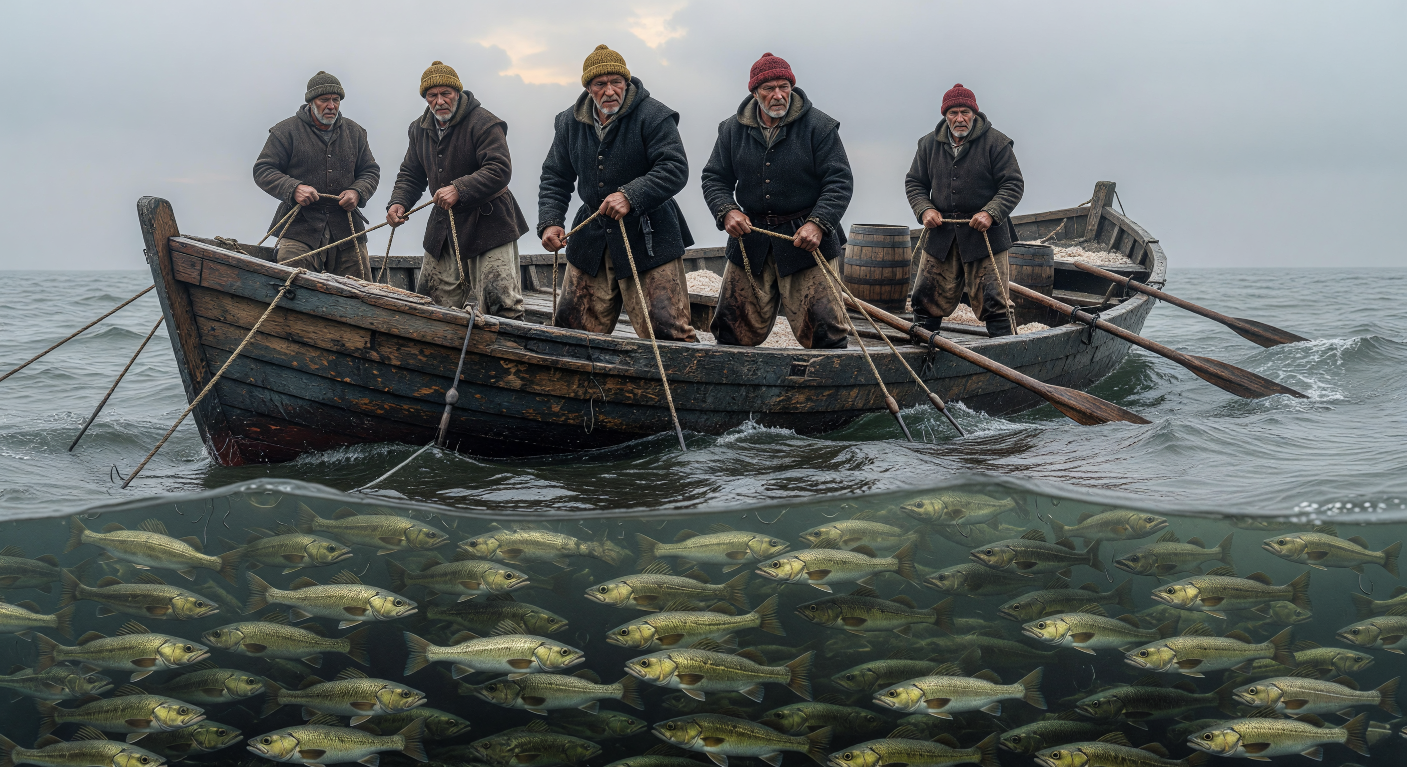 IMAGE: The image depicts a small open wooden boat with oars, crew in heavy wool coats, knit caps, and trousers hauling on lines amid choppy North Atlantic seas, which is visually coherent and broadly plausible for mid-16th-century Basque or European small-boat cod fishing on the Grand Banks. Clothing aligns with period cold-weather wool garments (dark, layered, salt-crusted appearance), and the oak clinker-built shallop-like vessel matches early modern designs used in the region. No glaring anachronisms in technology or architecture. However, the split underwater view is a modern artistic trope undermining historical immersion, and the dense school of fish below does not resemble Atlantic cod (Gadus morhua)—they appear as generic silvery baitfish or perch-like with wrong body shape (too streamlined, lacking cod's barbels, mottled brown-grey coloration, and robust form). This biological inaccuracy misrepresents the fishery. Minor regional tweaks could add Basque specifics like berets or vessel rigging, but core issues are fixable with prompt refinement. I agree with GPT and Claude on fish density stylization and immersion-breaking perspective; fully concur with Claude's cod identification critique, which is spot-on and central.