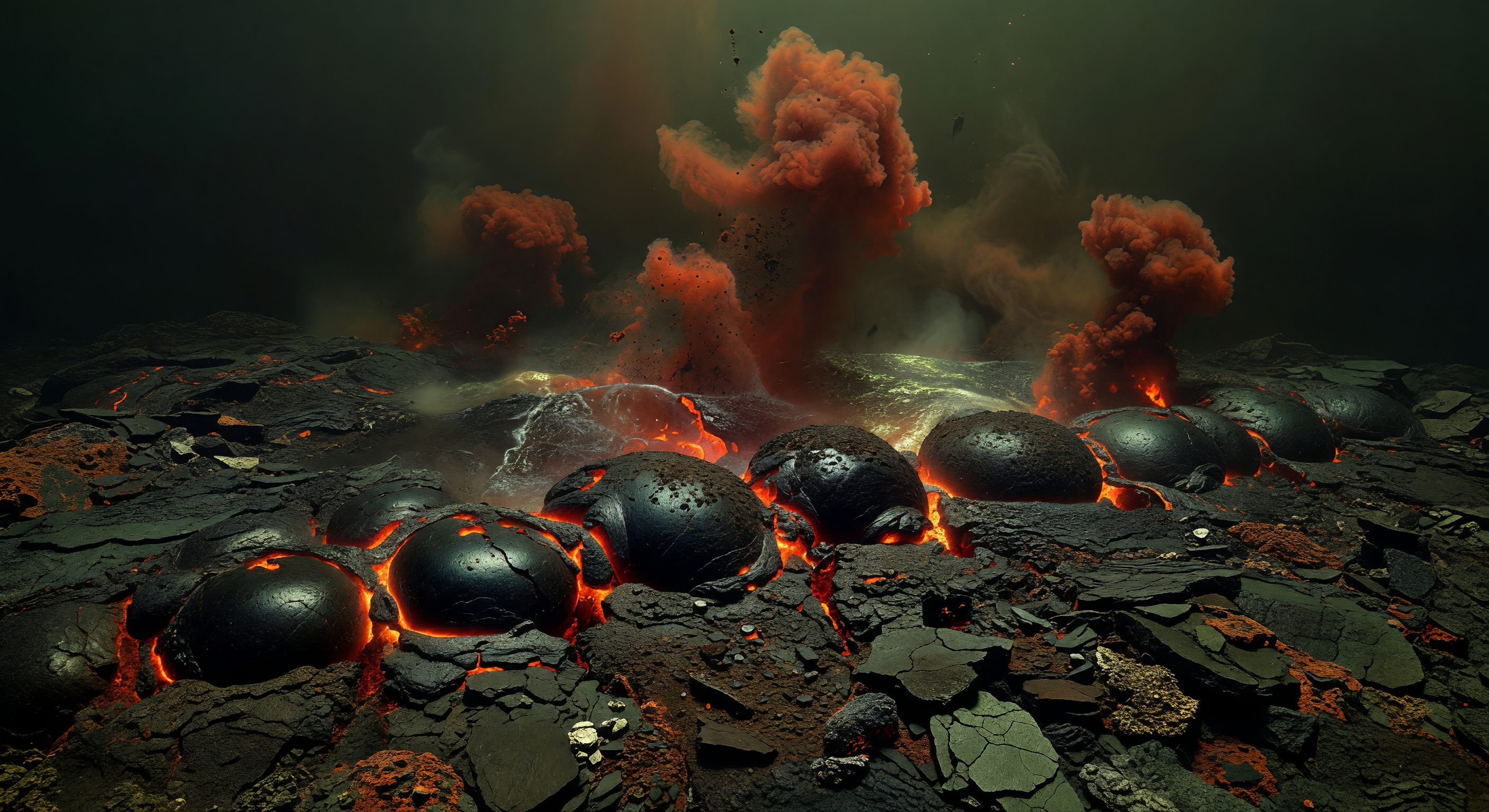 Caption: The overall story—basaltic volcanism under an anoxic ocean producing pillow lavas and vent-associated iron-rich (reddish) hydrothermal plumes—is plausible. However, several elements are either overstated or too specific/hand-wavy for high accuracy. “Rust-colored iron-rich plumes” is reasonable in concept (Fe oxides/hydroxides can color vent effluent), but the caption frames them as a definite composition without caveats; Hadean ocean chemistry is still uncertain. Also, “rapidly chilling into rounded pillow lavas on the dark mafic seafloor” is correct in principle, but the image depiction (prominent incandescent contact zones and cracked, near-dry texture) doesn’t strongly support rapid submarine quenching. The date range (4.4–4. Ga) is fine for late Hadean, but it would be safer to phrase the environment as “likely” or “could produce” rather than implying a specific well-known vent type and plume chemistry.