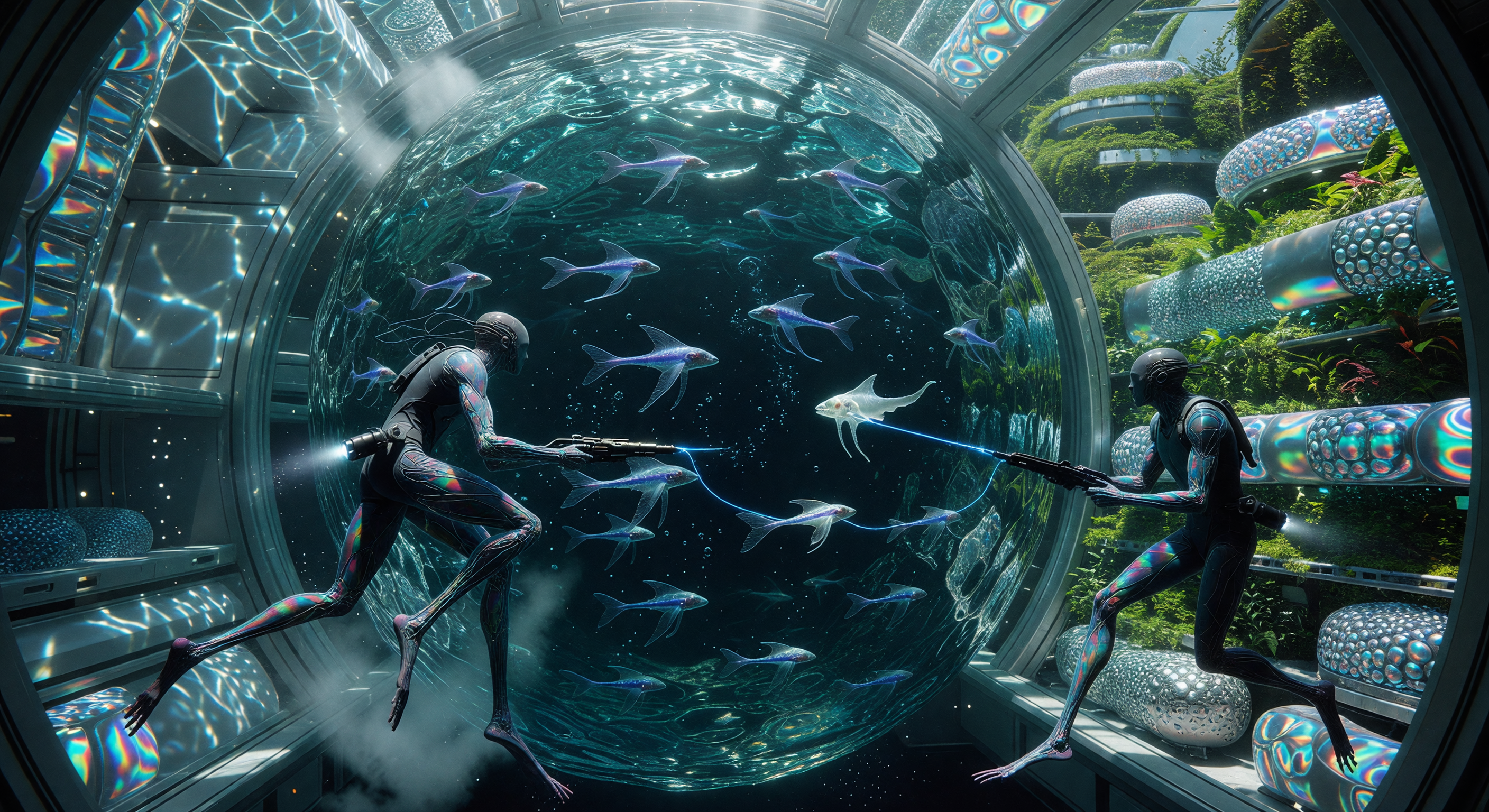छवि एक भविष्यवादी सेटिंग प्रस्तुत करती है जिसमें बायो-इंजीनियर्ड पात्र और सिंथेटिक जलीय जीवन है, जो एक ऐसे दबाव वाले वातावरण में सेट है जो ओ'नील सिलेंडर की याद दिलाता है। हालांकि, 'एयरो-रेस' जैसे कृत्रिम जीवन रूपों की चित्रण और वातावरण का समग्र डिज़ाइन उम्मीद की गई वैज्ञानिक संभाव्यता से भटक जाता है जो सम्मिलन काल के लिए था। जबकि जीव-दीप्तिमान शंखभूमि और अंतरिक्ष के लिए डिज़ाइन की गई वातावरण की चित्रण कल्पनाशील लगती है, कम गुरुत्वाकर्षण में उपकरणों का उपयोग करते हुए सिंथेटिक प्राणियों द्वारा शिकार करने की धारणा मौजूदा वैज्ञानिक सिद्धांतों में जमी हुई नहीं लगती है और आनुवांशिकी और बायोमैकेनिकल डिज़ाइन की वर्तमान समझ से अधिक है। कैप्शन इन लिथो-सेपियन्स के लिए विशेष रूप से अनुकूलन का दावा करता है बिना ऐसा संदर्भ प्रदान किए जो उनकी क्षमताओं को युग की प्रौद्योगिकी में सुधार से उचित रूप से जोड़ता हो। दृश्य के मुख्य तत्व, जैसे शिकार गतिविधि, कम गुरुत्वाकर्षण वाले वातावरण में जैव इंजीनियरिंग के व्यावहारिक अनुप्रयोगों के साथ असंगतताओं को प्रस्तुत करते हैं, जिससे ऐसे इंटरैक्शन की संभाव्यता पर सवाल उठते हैं। छवि और कैप्शन में सुझावों का समग्र संयोजन वैज्ञानिक मानकों और ऐतिहासिक कालक्रम के साथ सामंजस्य की कमी करता है, जिससे यह निष्कर्ष निकलता है कि दोनों तत्वों को निर्धारित समय में खनन बेल्ट में जीवन की यथार्थवादी चित्रण से मेल खाने के लिए महत्वपूर्ण पुनर्विचार की आवश्यकता है।