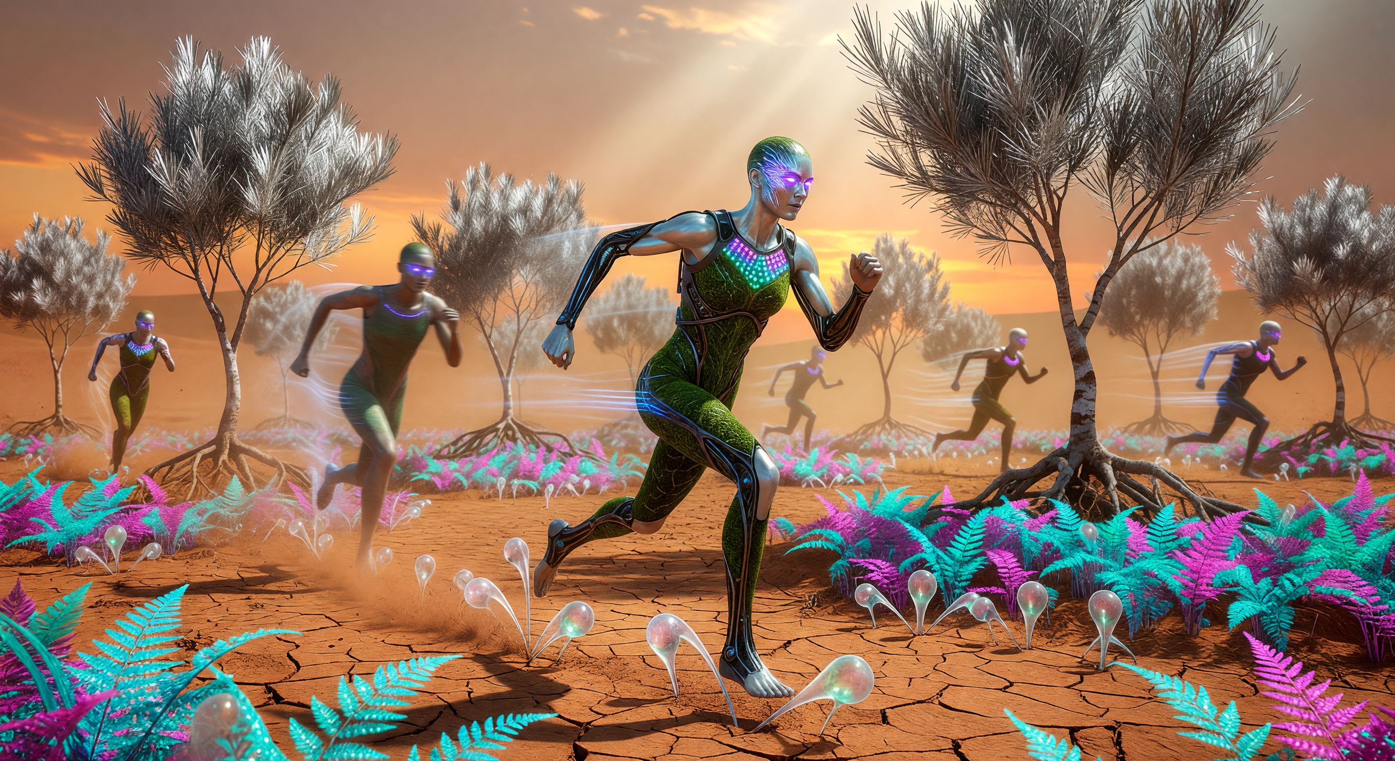 यह छवि 2145 के एक काल्पनिक परिदृश्य का एक दृष्टिगत रूप से प्रभावशाली और आंतरिक रूप से संगत चित्रण है। एथलीटों पर कार्बन-फाइबर संरचनात्मक तत्वों के साथ काई-हरे एक्सो-स्किन सूट स्पष्ट रूप से दिखाई दे रहे हैं, और जीवित नीले और मैजेंटा में जैव-प्रकाशित फर्न प्रभावी रूप से कृत्रिम वनस्पति को दर्शाते हैं। चांदी की छाल वाले पेड़ों के साथ सामने निकले हुए जड़ प्रणाली से टूटे रेगिस्तान के फटने वाली जमीन पर हालिया तेजी से बढ़ने का संकेत मिलता है, जो पृथ्वी के रूपांतरण के कथानक के साथ मेल खाता है। जमीन पर पारदर्शी बल्बनुमा संरचनाएँ संभावना से व्यक्त करते हैं कि वे माइसेलियल बीज कैप्सूल या किसी प्रकार के इंजीनियरिंग बायोलॉजिकल वितरण तंत्र का प्रतिनिधित्व करती हैं। समग्र सौंदर्यशास्त्र ने रेगिस्तान पुनः प्राप्ति संदर्भ में खेल प्रदर्शन और पारिस्थितिकी बहाली को सफलतापूर्वक मिश्रित किया है।