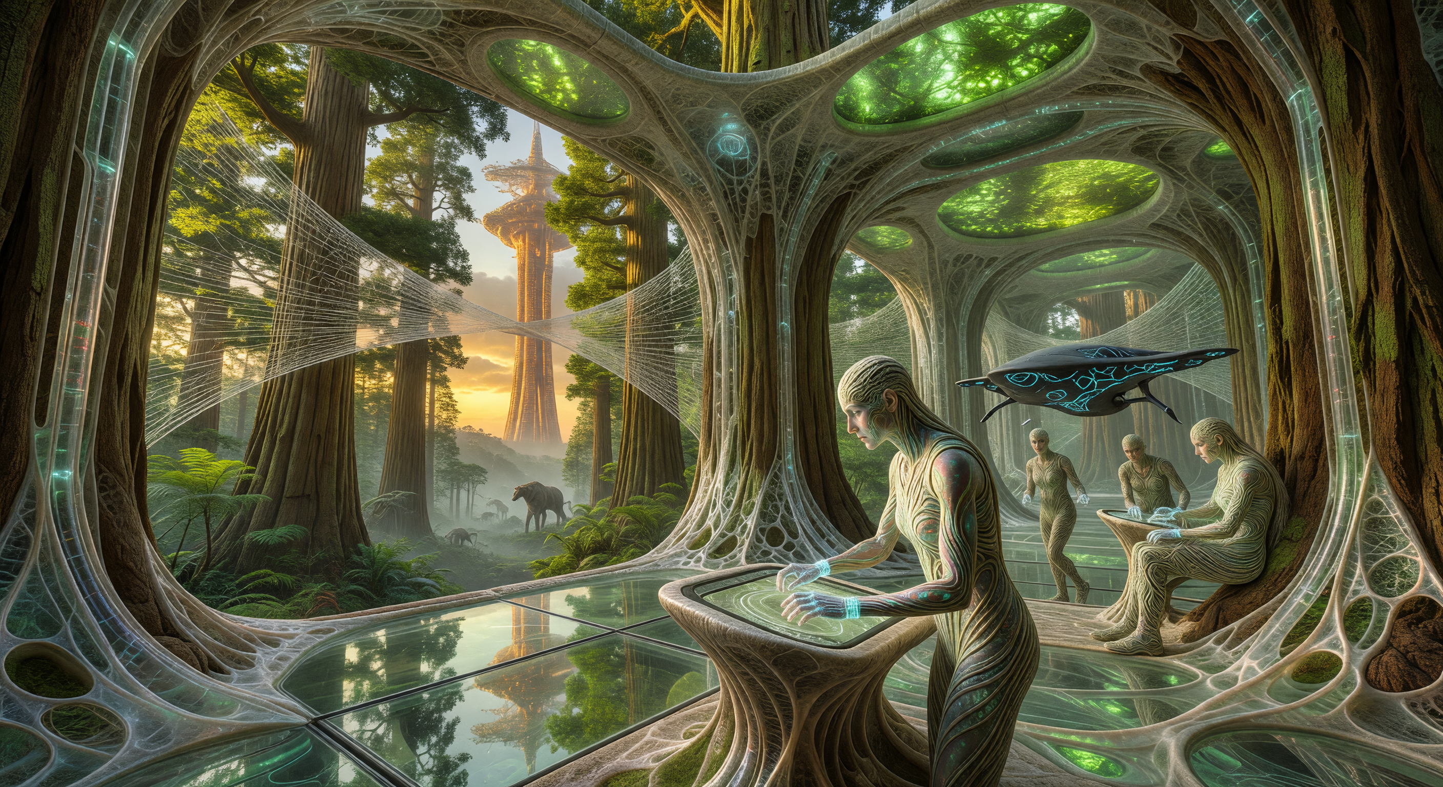 यह चित्र 2145 के काल्पनिक जैव प्रौद्योगिकी-शहरी भविष्य का एक दृश्य रूप से संगत और संभाव्यता से भरा चित्रण है, जिसमें 'संयोग' युग के लिए कोई तात्कालिकता या ऐतिहासिक अशुद्धियाँ नहीं हैं। प्रमुख तत्व जैसे कि विशाल आनुवांशिक रूप से संशोधित सीकोइया का आंतरिक भाग, पारदर्शी जैविक जाली (Biolith-समान) से मजबूत, दीवारों/छत पर चमकती हरी शैवाल के पैनल, और पेड़ों के बीच कार्बन-फाइबर जाले के पुल सही हैं। मनुष्यों में सूक्ष्म इरीडेसेंट फ्रैक्टल-त्वचा के पैटर्न (नग्न जैसी आकृति पर नीले फ्रैक्टल डिज़ाइन), एक चमकती होलोग्राफिक कंसोल के साथ बातचीत करते हुए दिखाई देते हैं, जो उन्नत इंटरफेस का आभास कराती है। फिर से जंगली बने वन पर जमीन के स्तर पर मेगाफ़ौना (हाथी जैसे जीव) और एक ऊंची मंटा-रे ड्रोन/जीव से समृद्ध विश्व का निर्माण किया गया है, जो वैज्ञानिक रूप से पुनः विलोपन और जैव-ड्रोन के माध्यम से संभव है। परिदृश्य एकरूपता से संयोजित होता है, सूर्यास्त के प्रकाश से जैविक-तकनीकी संयोजन को बढ़ाता है—आर्किटेक्चर और शहरीकरण क्षेत्र के लिए बहुत उपयुक्त है।