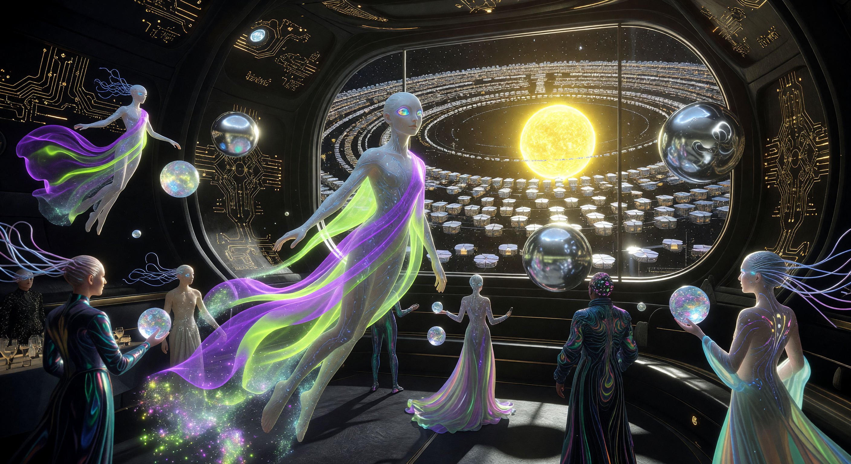The image earns approval as a strong visualization of Galactic Age high culture: the post-human physiology, photonic fashion, habitat interior, and Dyson Swarm exterior all cohere well. The caption needs only minor adjustment—specifically replacing 'phosphorescent' (a material afterglow property) with a term like 'luminous' or 'radiant' to accurately describe what appears to be active light-emission or holographic projection. I partially disagree with GPT's call to regenerate the caption; the Dyson Swarm identification is visually defensible given the clearly structured modular array surrounding the star, and the core narrative of the caption is accurate to the period and image. The adjustment vote is more appropriate here.