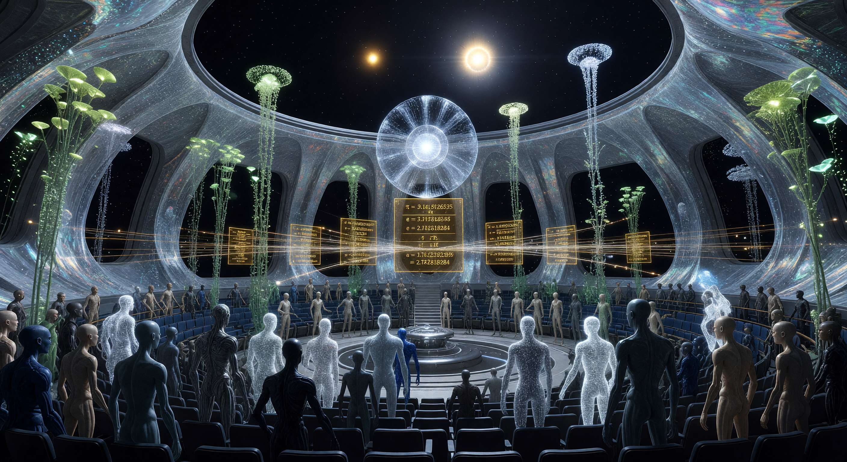 The image presents a visually compelling assembly hall with a domed, open-topped structure revealing a starfield with two visible stellar objects, which works well for an Oort-cloud habitat setting. The mixed assembly of opaque humanoid figures and translucent/glowing entities effectively represents the biological-digital coexistence described. The bioluminescent plant-like structures hanging from above are a creative and plausible touch for an enclosed habitat. The central glowing sphere and surrounding holographic displays showing mathematical constants (π, e, etc.) provide a nice sense of advanced, numerically-grounded governance. However, the figures are largely human-proportioned and show no obvious morphological adaptations suggesting 2.5-meter height or lead-bismuth shielding, which the caption specifically claims. The 'ferrofluid cloud' manifestation of digital consciousnesses is not visually represented—instead we see humanoid wireframe/glowing forms, which is a meaningful discrepancy from the caption's description.