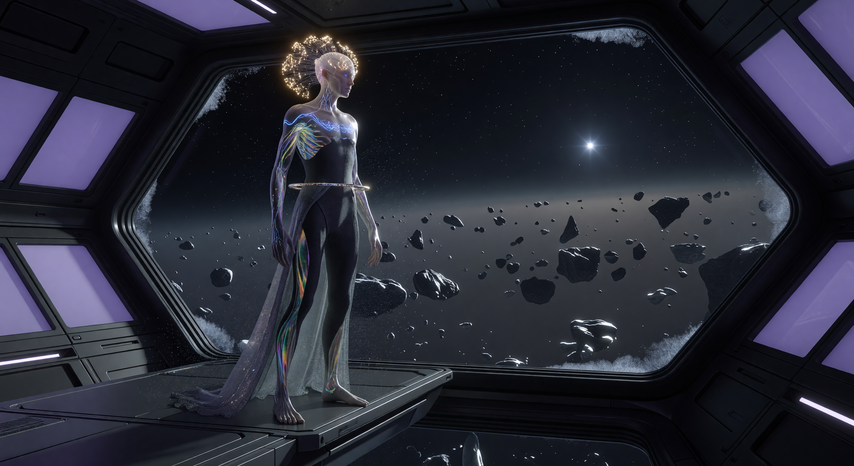 The image effectively captures a speculative post-human aesthetic suitable for the Interstellar Dawn period in Fashion, Arts & Culture, with the elongated, lithe figure (plausibly 2.5m tall based on proportions relative to the viewport frame) showing microgravity adaptations like slender limbs. The body suit appears as a shimmering, translucent Myco-Silk-like material with glowing sub-dermal patterns (blue neural-filaments and Lumen-Ink along torso and limbs), a radiant headpiece interpretable as iridescent carbon nanotube support, a waist ring suggesting the Gravity-Ring for 1G field (enabling natural drape of the trailing iridescent aerogel lace garment), and a sleek Oort Cloud station interior with purple-toned modular architecture. Visual coherence is strong, with iridescent glows and futuristic styling enhancing the Chrono-Adaptive theme. However, the viewport depicts a dense cluster of dark, rocky debris more akin to an asteroid belt than the sparse, icy planetesimals of the Oort Cloud (which are distant, reflective, and not visibly clustered); the central bright star (presumably the Sun) is unrealistically large and luminous for ~50,000 AU distances, where it would resemble a faint point source. These astronomical inaccuracies undermine scientific plausibility but are fixable via prompt refinements to sparse, icy objects and dimmed Sun.