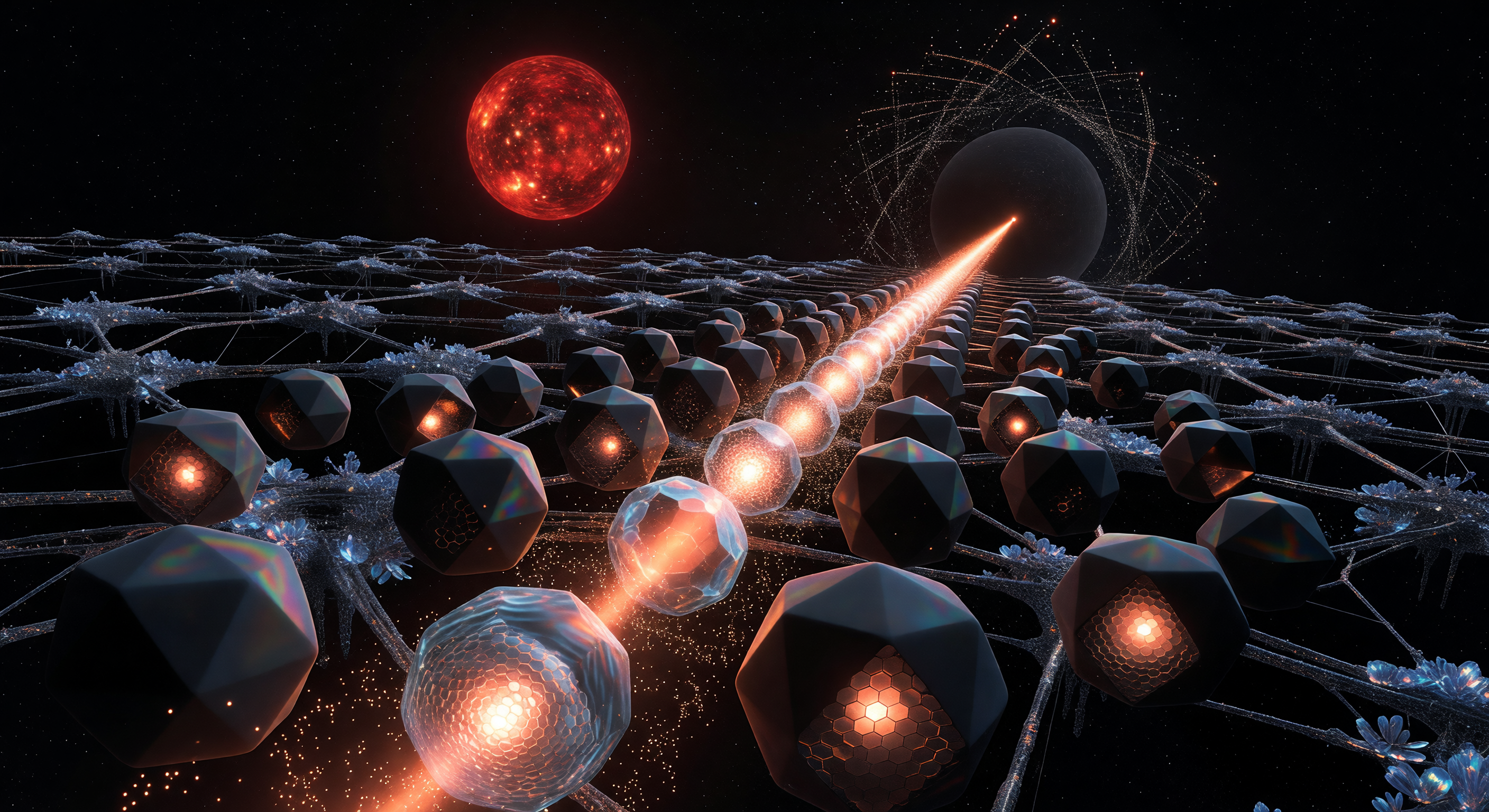 The image effectively captures a speculative future scene in Barnard's Star system, with a prominent red dwarf star accurately depicted as a dim, reddish M-type dwarf, consistent with astronomical data on Barnard's Star (an real flare star ~6 light-years away). The polyhedral avatars—icosahedral and dodecahedral forms glowing and aligned along a coherent orange beam—visually represent SIMs recharging via maser, with hexagonal textures plausibly suggesting energy-absorbing surfaces. The foreground lattice of interconnected nodes and crystalline 'utility fog' structures evokes programmable nanotech in vacuum, and the background dark sphere with radial swarms suggests a statite mirror array beaming stellar energy. No anachronisms or cultural inaccuracies apply to this far-future interstellar setting; the composition is visually coherent, scientifically plausible for deep space (no implied planetary surface, pure void with structures), and free of geological/biological errors. Minor visual tweaks could enhance scale (e.g., clearer interstellar distances), but it's approvable as-is.