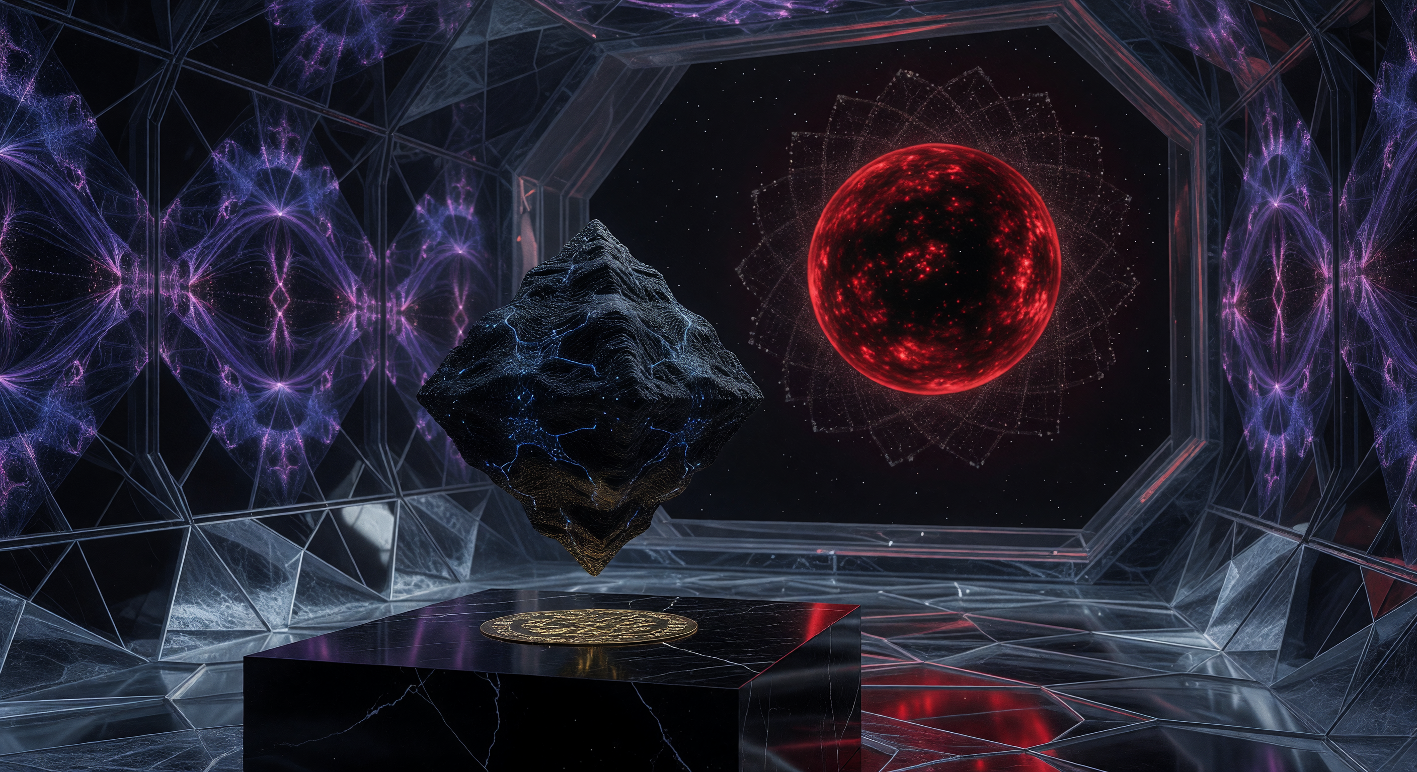 The image effectively captures a far-future, post-human computational laboratory orbiting Barnard's Star, with strong scientific accuracy in key elements. The prominent red stellar body through the viewport is precisely consistent with Barnard's Star (M4V red dwarf, ~6 light-years away, dim crimson light), and its apparent size suggests a close orbital view, plausible for a hypothetical habitat. The geometric polyhedron (dark, crystalline, with internal blue glow) hovering over the gold-plated disc on a black plinth aligns well as a visual representation of a 'programmable smart-dust' Archivist-Entity examining a 21st-century relic, evoking diamondoid/vacuum-engineered tech without anachronisms. The interior architecture—polygonal, reflective surfaces—feels coherent for advanced nanotechnology structures. However, minor issues include the fractal purple holographic/mandala patterns on walls, which introduce a decorative, almost mystical flair that clashes with the caption's 'silent, mathematical reality' and 'cold-state laboratory' (implying cryogenic minimalism); these read more cyberpunk-fantasy than pure computational austerity. The gold disc lacks visible etching or silicon details, appearing as a generic relic, but this is a subtle prompt-refinement fix. No cultural/period anachronisms, excellent visual coherence and astronomical plausibility.