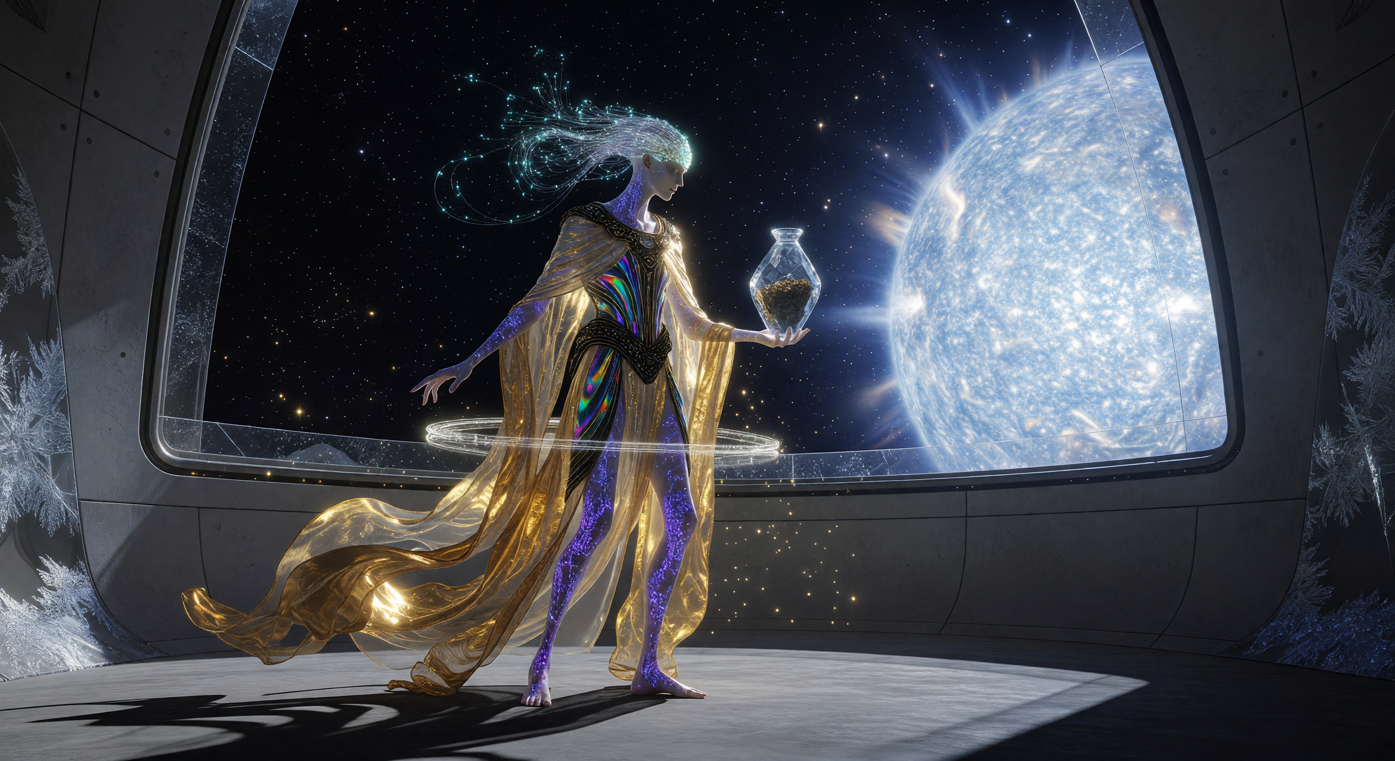 The image excels in visual coherence and speculative plausibility for the Interstellar Dawn period (c. 300–500 CE) in the Fashion, Arts & Culture zone. The central figure has an elongated, 'Lithe-Long' physique with flowing fiber-optic neural filaments from the head, matching advanced biological engineering. The robes appear as iridescent, atomically thin gold foil with dramatic draping in microgravity, enhanced by a prominent glowing hoop/ring at the waist that convincingly represents the wearable gravity-ring. The figure holds a small, clear vial with dark contents, ideal for 'Relic-Soil.' The architecture—a sleek, high-tech observatory with a massive viewport—is spot-on for a spaceborne stellar observatory, and the blinding blue-white star looms large and scientifically plausible as a young, hot O/B-type star (intense blue hue, radiant corona). Subtle crystalline/icy formations frame the edges, adding an artistic, Oort-cloud inspired touch without disrupting coherence. No anachronisms; biology, tech, and astronomy align imaginatively yet grounded in extrapolated science. I approve the image outright, disagreeing with GPT/Claude's 'adjust'—it's a strong match without needing refinements.