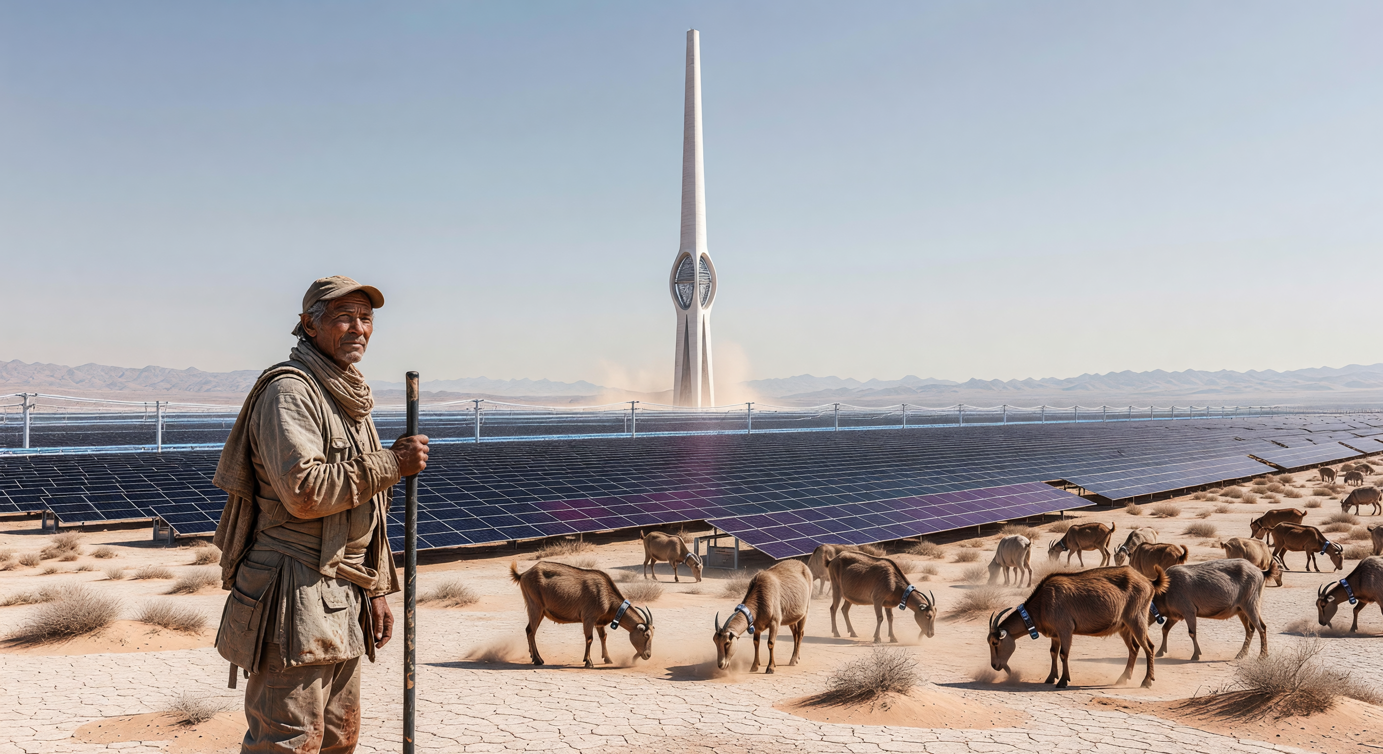 The image effectively captures the core concept of the 'Great Transition' duality — a weathered herder with a staff, goats grazing near sprawling solar arrays, arid Mojave-like landscape with cracked earth, sparse scrub, and distant mountain ranges. These elements are all plausible and visually coherent for a mid-2040s Mojave setting. The herder's clothing (layered, worn, practical desert gear) is appropriately ambiguous — reading as contemporary-to-near-future without being anachronistic. The goats wear what appear to be tech-integrated collars, a nice subtle nod to genetic/tech management without being heavy-handed. The central tower is architecturally distinct from a simple industrial stack — it has a sleek, monumental, almost sculptural quality with what appears to be an air-intake module mid-shaft, which is visually plausible as a near-future DAC structure, though not definitively so. The solar panels show a slight purple-blue iridescence on some rows, which could loosely suggest perovskite layering, though it's subtle.