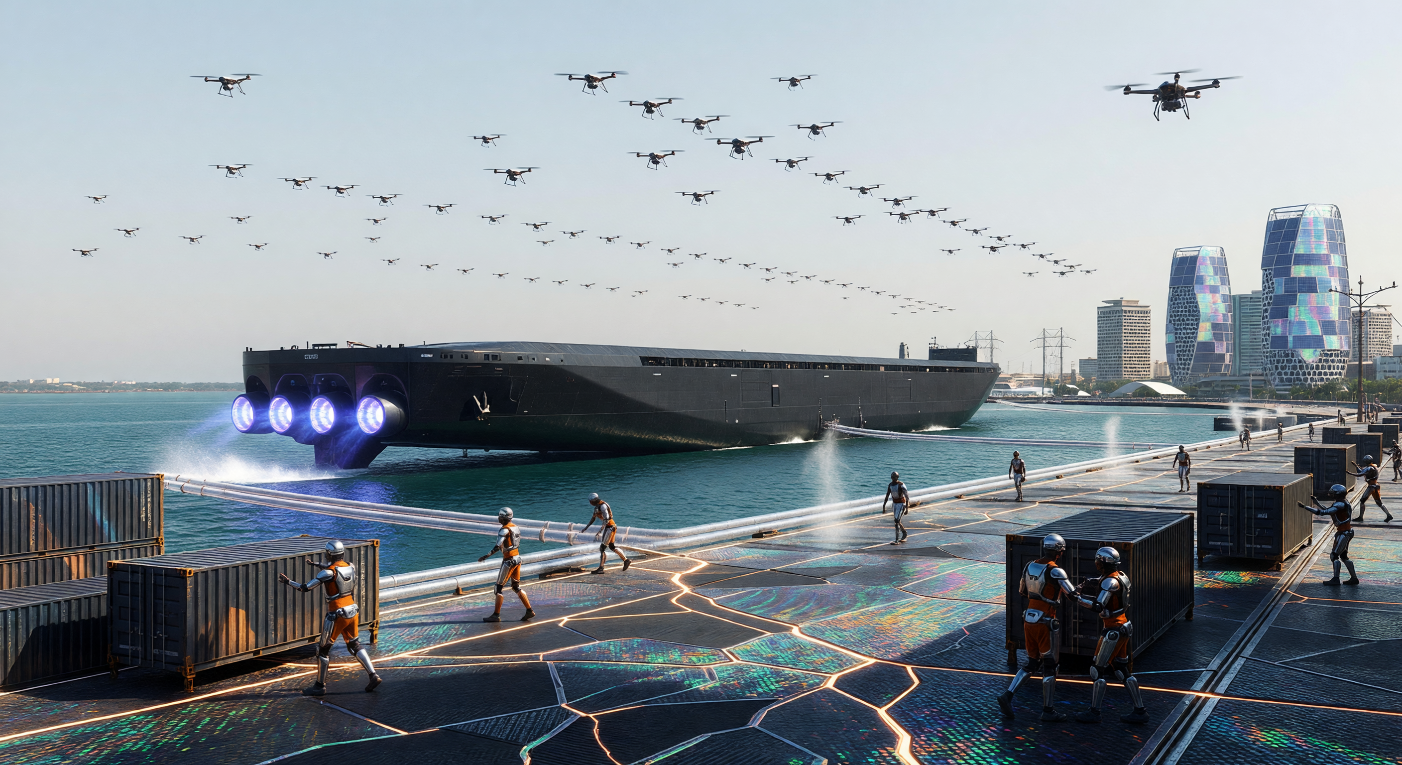 सन् 2050 के 'दहलीज युग' (Threshold Era) का यह दृश्य मोम्बासा बंदरगाह पर विशाल आयन-प्रणोदन मालवाहक जहाजों को कार्बन-नैनोट्यूब से निर्मित स्व-मरम्मत कंक्रीट के घाटों पर डॉक करते हुए दिखाता है। यहाँ 'किपाजी' (Kipaji) न्यूरल इंटरफेस और टाइटेनियम एक्सोस्केलेटन से लैस *होमो सेपियंस* की उन्नत पीढ़ी, स्वायत्त ड्रोन झुंडों के साथ मिलकर एक उच्च-तकनीकी अफ्रीकी भविष्य का संचालन कर रही है। यह कालखंड मानवता के कार्डाशेव स्केल पर 0.72 की ओर बढ़ने और जैव-तकनीकी एकीकरण के उस महत्वपूर्ण मोड़ को दर्शाता है, जिसने पूर्वी अफ्रीका को वैश्विक ऊर्जा और लॉजिस्टिक्स के केंद्र के रूप में स्थापित किया।