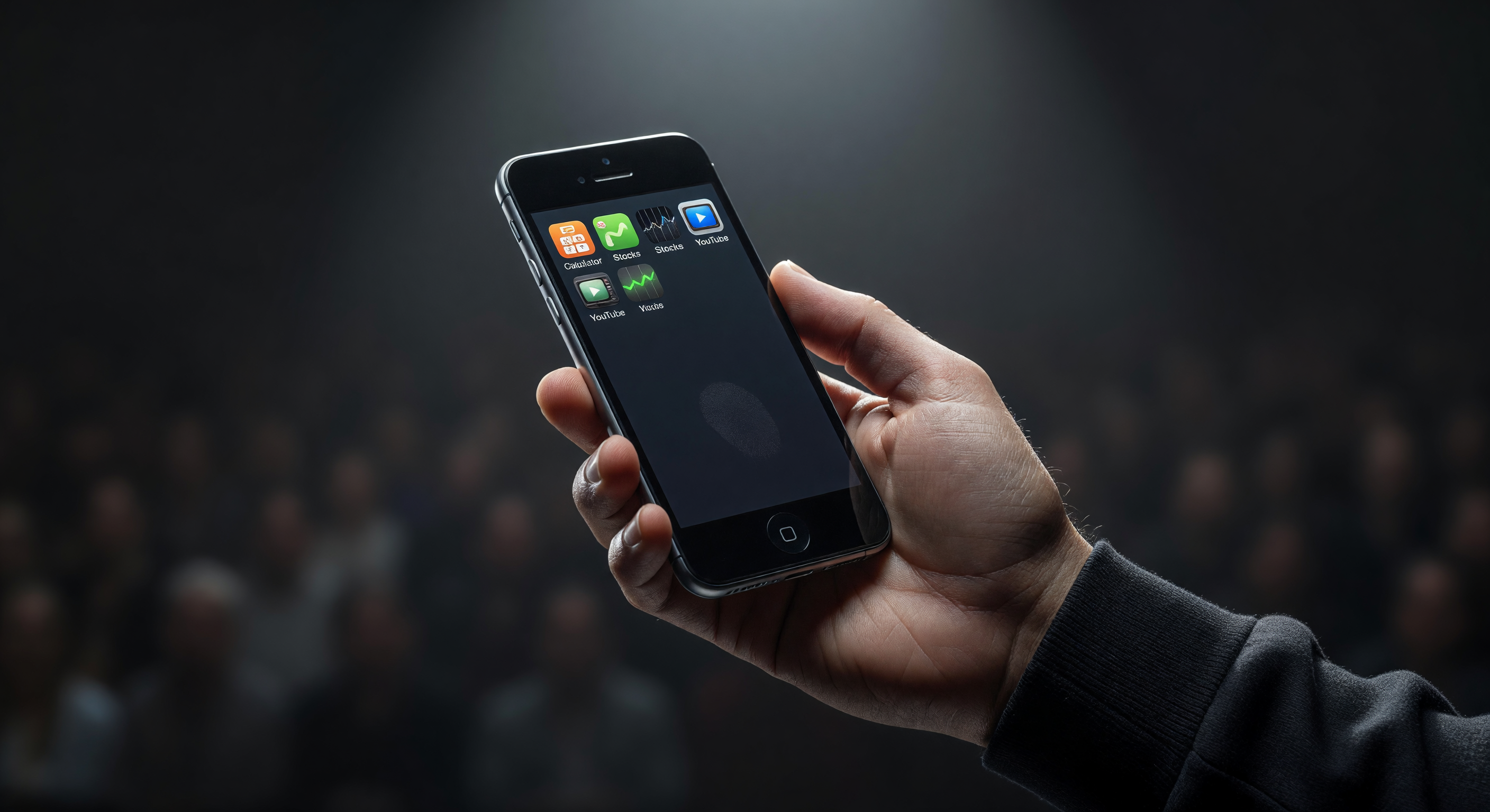 The image depicts a close-up of a hand holding a smartphone in a darkened keynote-style audience setting, which is plausible for the 2007 iPhone debut at Macworld. However, the device itself is a major anachronism: it matches the iPhone 5/5s (2012-2013) with chamfered aluminum edges, a taller thinner black body, and a ringed home button, rather than the original 2007 iPhone's rounded plastic/aluminum back, thicker squarish form, and unringed home button. The screen shows a sparse, generic icon grid (e.g., green leaf-like app, blue square) that vaguely evokes early iOS but lacks the precise 4x3 layout of Phone, Mail, Safari, and iPod apps on the actual 2007 home screen, with icons appearing more modern and AI-generated. No clothing or background elements are visibly inaccurate (sweatshirt sleeve is generic), but the core device's form factor error is significant, requiring a full regenerate rather than prompt tweaks, as it's not remotely a first-gen iPhone.