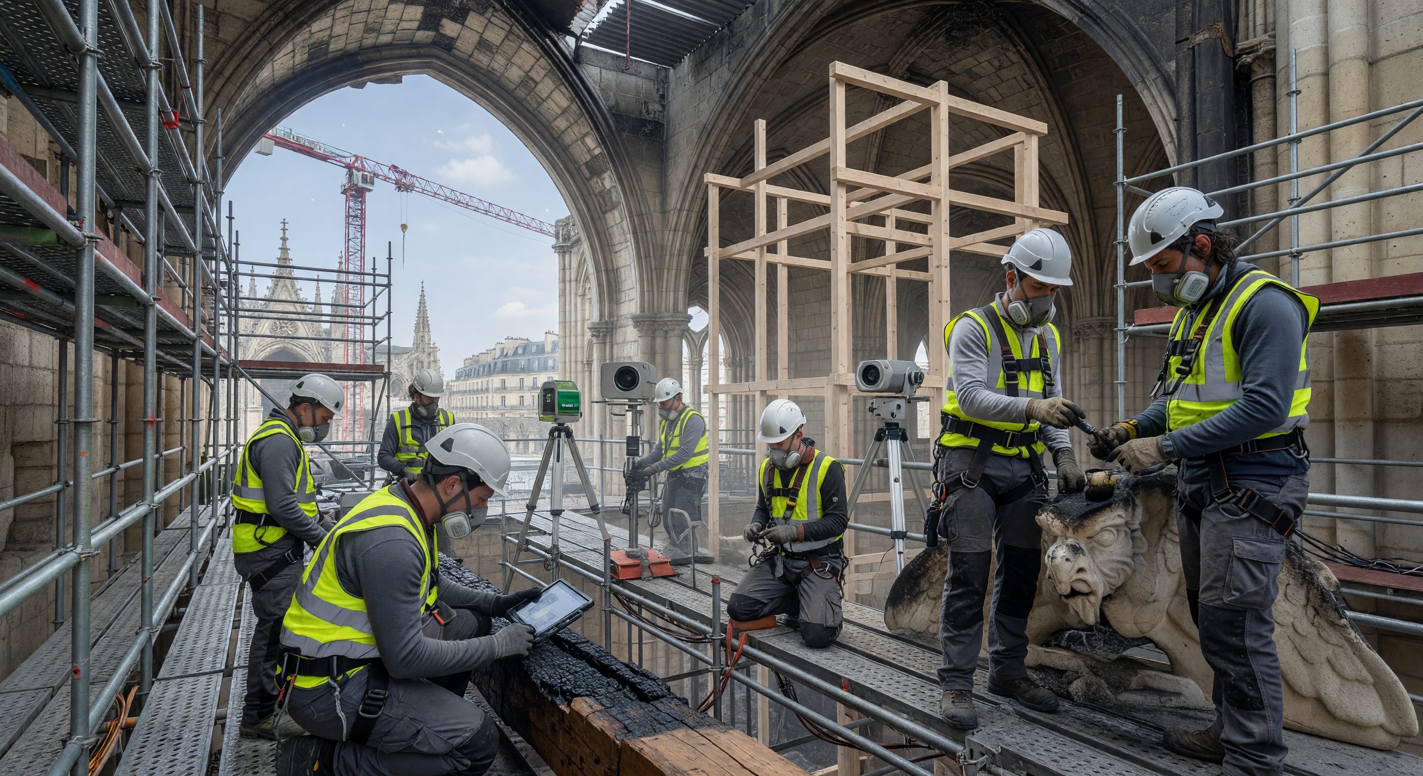 यह चित्र 2022 के दौरान पेरिस के नोट्रे-डेम कैथेड्रल के पुनर्निर्माण के गहन प्रयासों को दर्शाता है, जहाँ कुशल कारीगर विशाल मचानों पर चढ़कर अग्नि से क्षतिग्रस्त मध्यकालीन चूना पत्थर और झुलसी हुई ओक की लकड़ियों को सहेज रहे हैं। सुरक्षा उपकरणों और डिजिटल टैबलेट से लैस ये पेशेवर 13वीं शताब्दी की कलाकृति को आधुनिक तकनीक के साथ पुनर्जीवित कर रहे हैं। यह दृश्य ऐतिहासिक विरासत के संरक्षण में प्राचीन शिल्प कौशल और 21वीं सदी की इंजीनियरिंग के अद्भुत संगम का प्रतीक है।