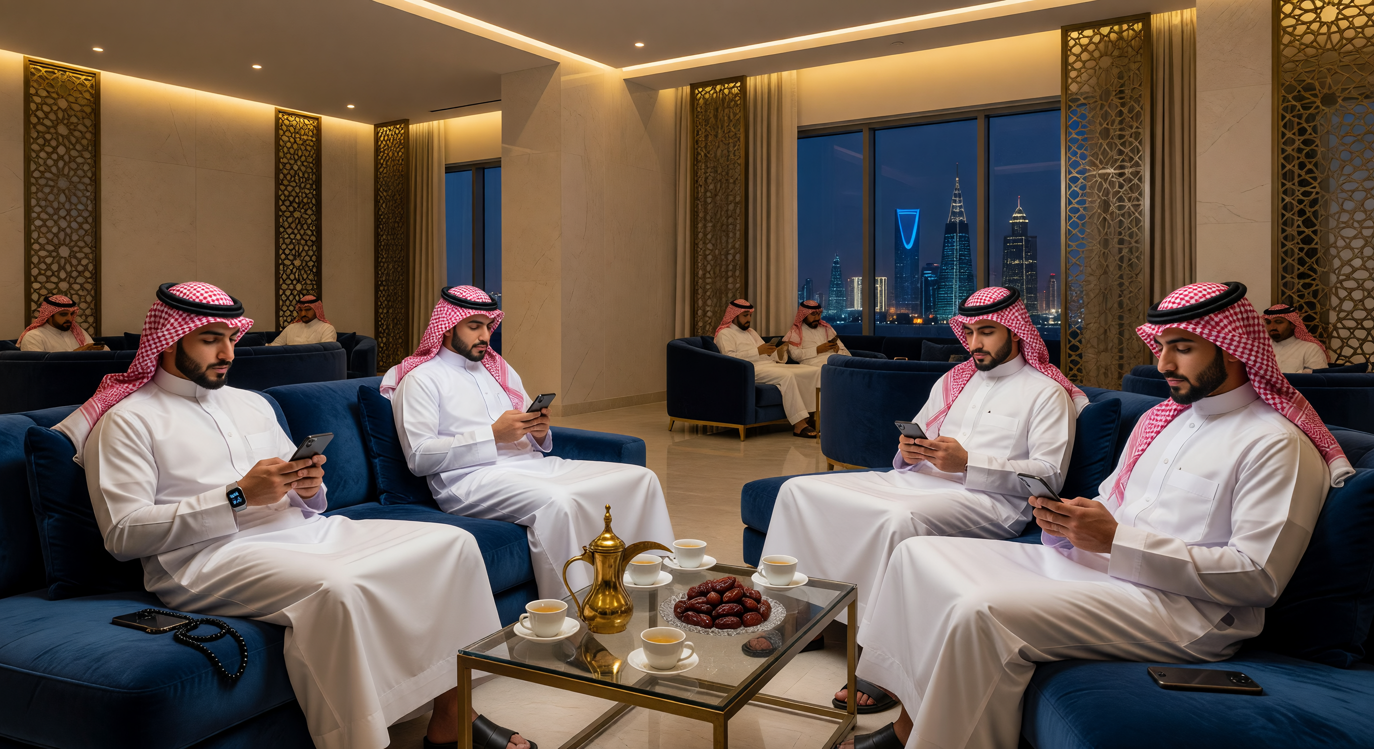 - English: Digital Riyadh Majlis with Saudi Men and Smartphones