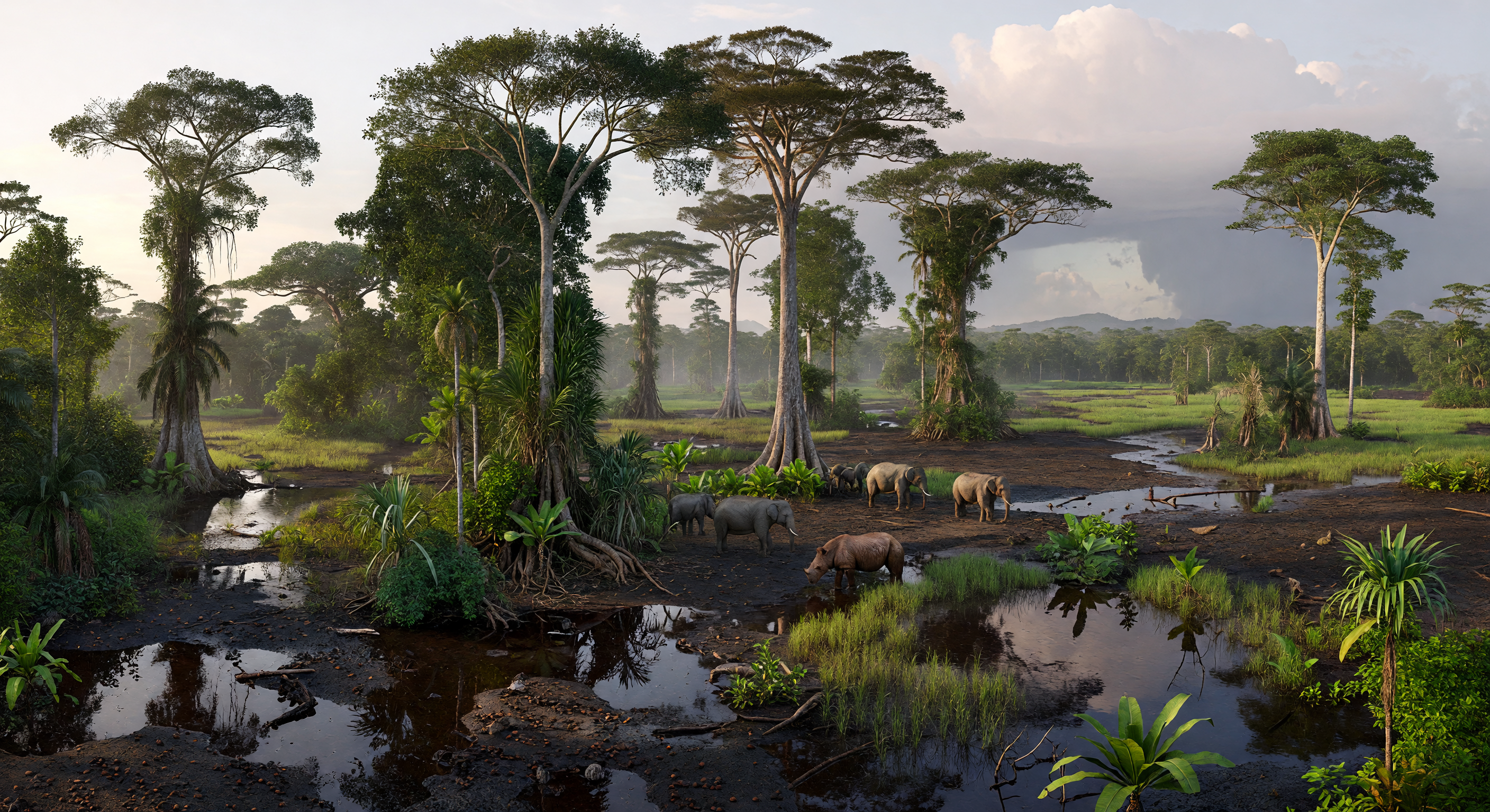 हिमयुग के उत्तर प्लाइस्टोसीन, लगभग 1,26,000 से 11,700 वर्ष पहले, समुद्र-स्तर नीचे गिरने पर उजागर हुए सुंडालैंड के विशाल समतल पर यह दृश्य आर्द्र उष्णकटिबंधीय शरणस्थल का एक दुर्लभ क्षण दिखाता है। काले जलोढ़ और पीट-मिश्रित दलदली soils पर 50–70 मीटर ऊँचे डिप्टेरोकार्प दिग्गज—विशेषतः शोरिया (Shorea) और डिप्टेरोकार्पस (Dipterocarpus)—आकाश छूते खड़े हैं, जबकि उनके बीच एशियाई हाथियों Elephas maximus का छोटा झुंड और घने रोएँ वाला सुमात्राई गैंडा Dicerorhinus sumatrensis रैटन, अंजीरों और काली दलदली जलकुंडों के बीच से गुजरते हैं। यह वन केवल हरियाली नहीं, बल्कि गहरे समय की जीवित स्मृति है—एक ऐसा पारिस्थितिक आश्रय जहाँ बदलती जलवायु के बावजूद वर्षावन और उसकी विशिष्ट जीव-जगत रेखाएँ टिके रहीं।