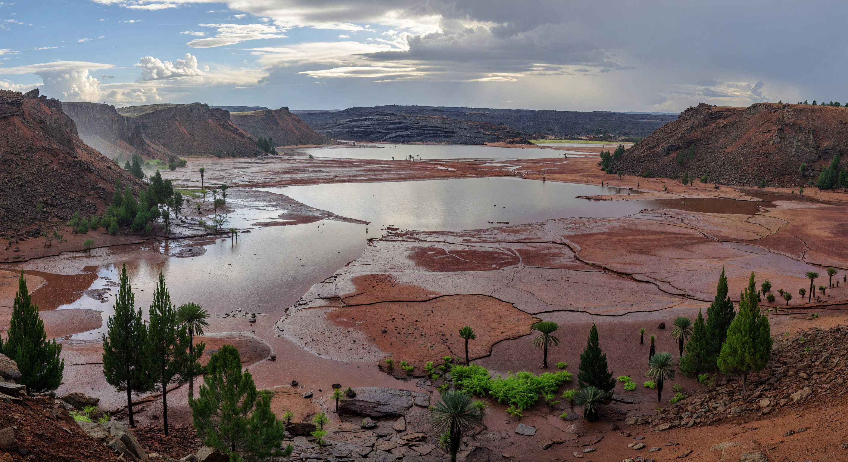 The committee broadly agrees that the scene successfully conveys an Early Jurassic rift-basin setting: red-bed mudflats, shallow ephemeral lakes, rain-darkened surfaces, fault-bounded valley walls, and a generally dry but seasonally wet landscape are all visually and textually consistent with Jurassic Laurasia. Several reviewers also found the dark distant volcanic terrain plausibly compatible with weathered basaltic flows, and the overall atmospheric storm/runoff mood is a strong match for the caption.