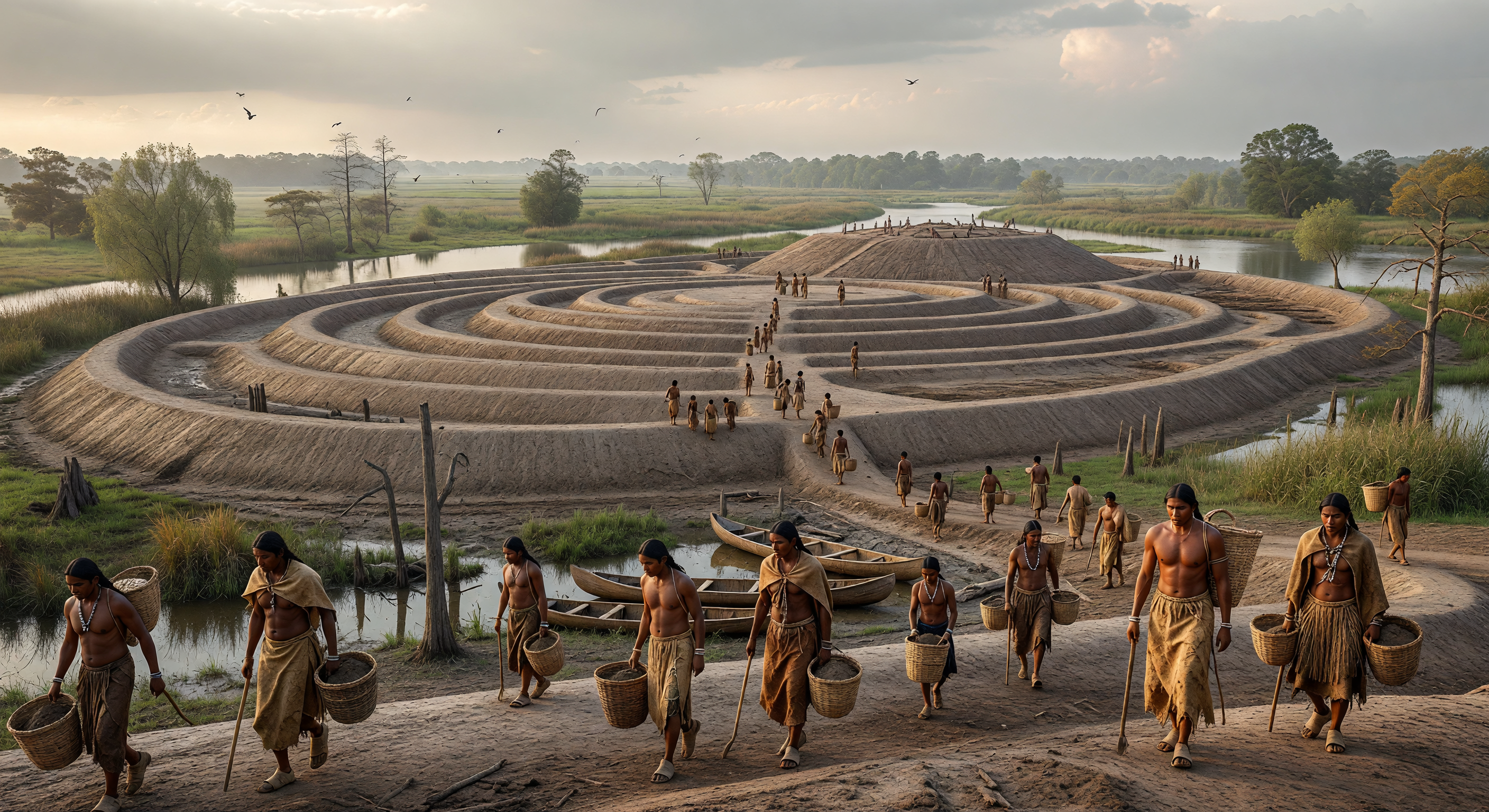लोअर मिसिसिपी घाटी के आर्द्र आकाश तले यह दृश्य पॉवर्टी पॉइंट के विशाल अर्ध-अंडाकार मिट्टीबंधों और बनते हुए मंचाकार टीले को दिखाता है, जहाँ स्त्री-पुरुष और युवा मिलकर बुनी टोकरियों में मिट्टी ढो रहे हैं। लगभग 140–110 ईसा पूर्व का यह स्मारकीय परिसर उत्तर अमेरिका की उन स्वदेशी समुदायों की असाधारण इंजीनियरिंग और सामुदायिक श्रम का प्रमाण है, जिन्होंने बिना धातु के औज़ारों, पहिए या बोझा ढोने वाले पशुओं के, धरती को योजनाबद्ध रूप से आकार दिया। पास की खाड़ी किनारे खींची गई डोंगी नौकाएँ यह भी याद दिलाती हैं कि पॉवर्टी पॉइंट केवल निर्माण का स्थल नहीं था, बल्कि दूर-दराज़ के विनिमय जालों से जुड़ा एक महत्वपूर्ण अनुष्ठानिक और सामाजिक केंद्र भी था।
