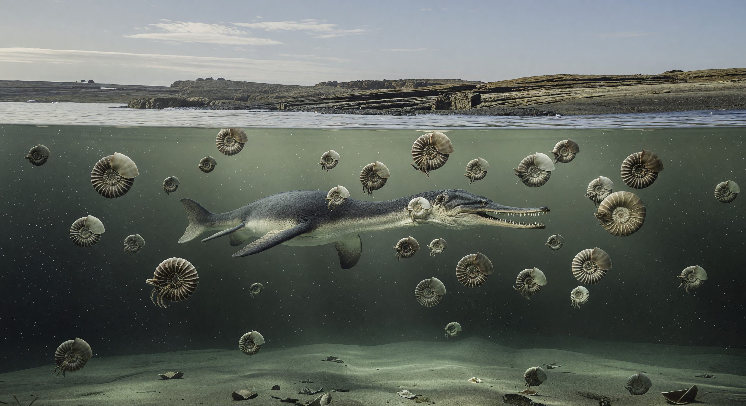 लगभग 7 से 6.6 करोड़ वर्ष पहले, अंतिम क्रिटेशस के मास्ट्रिख्टियन काल में अंटार्कटिक प्रायद्वीप के जेम्स रॉस बेसिन की ठंडी, हरी-धूसर समुद्री जलराशि में लगभग 6 मीटर लंबा प्लेसियोसौर Morturneria seymourensis अपनी चौड़ी, चपटी थूथन और अनेक छोटे दाँतों वाले सिर के साथ शिकार की तलाश में तैरता दिखाई देता है। उसके चारों ओर पसलीदार Maorites और अधिक चिकने Gaudryceras अमोनाइटों के झुंड मंडरा रहे हैं, जिनमें कुछ के मुलायम शरीर खोल के मुहाने पर झलकते हैं, जबकि ऊपर मंद ध्रुवीय सूर्य का प्रकाश बर्फ-रहित समुद्र पर धुंधला छनता है। यह दृश्य याद दिलाता है कि डायनासोर युग के बिलकुल अंत में भी अंटार्कटिका कोई जमी हुई वीरानी नहीं, बल्कि उत्पादक, उच्च-अक्षांशीय समुद्री पारितंत्र था, जहाँ एलास्मोसॉरिड सरीसृप और अमोनाइट गोंडवाना के विखंडित होते दक्षिणी महासागरों में साथ-साथ फल-फूल रहे थे।