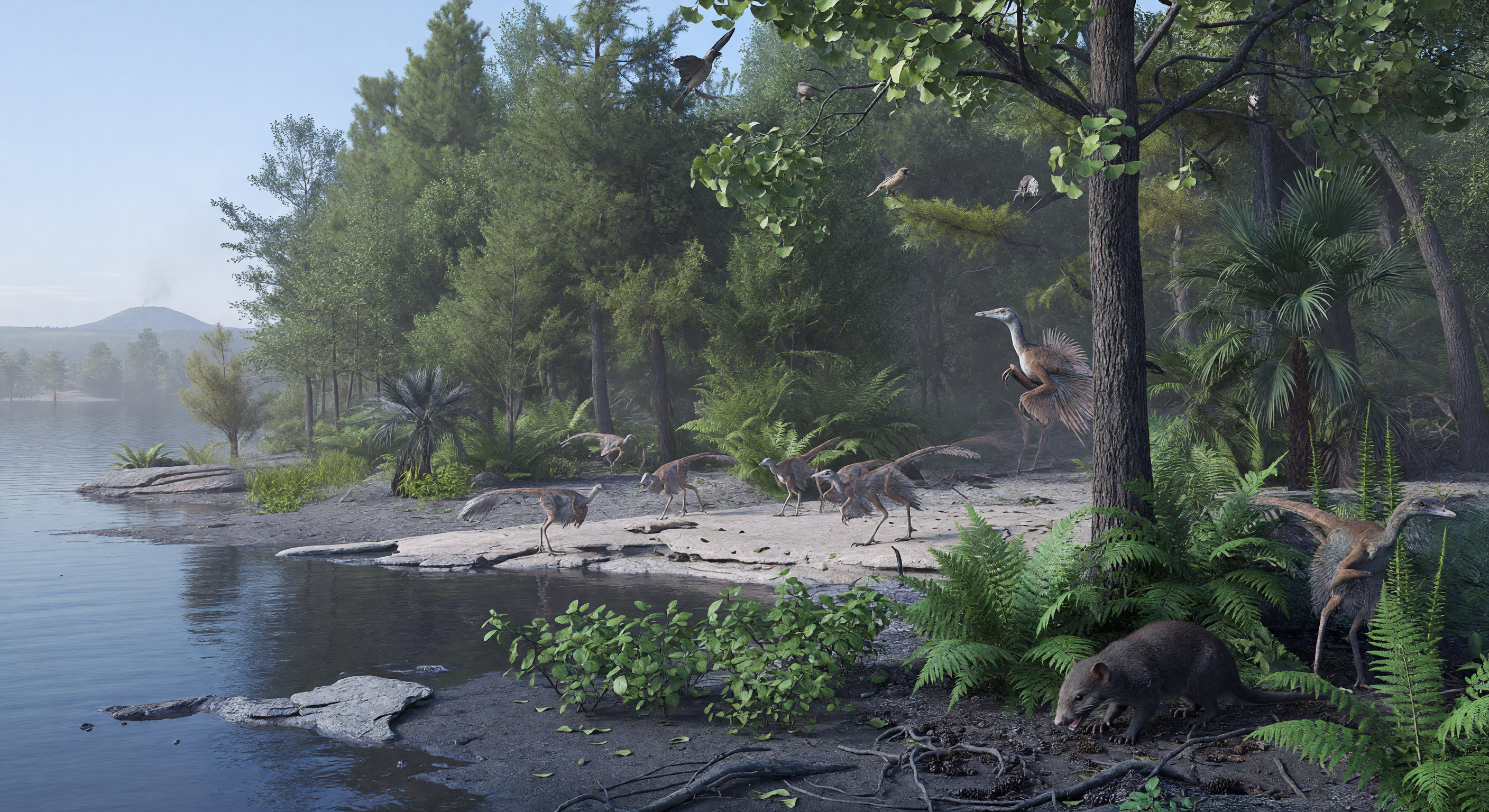लगभग 12.5 करोड़ वर्ष पहले प्रारम्भिक क्रिटेशियस काल में, उत्तर-पूर्वी चीन की यीशियन संरचना के झील-तटीय जंगल में राख से धुंधलाए गिंकगो और शंकुधारी वृक्षों के बीच पंखों वाला डायनासोर काउडिप्टेरिक्स भोजन तलाशता दिखाई देता है, जबकि ऊपर शाखाओं में छोटे एनैन्टिओर्निथीन और आदिम पक्षी फुदकते हैं। भूमि पर, लोमड़ी के आकार का स्तनधारी रेपेनोमामस फर्नों के बीच शिकार सूँघता फिरता है—यह जेहोल जीवसमूह की असाधारण दुनिया है, जहाँ ज्वालामुखीय राख ने झीलों, कीचड़ और महीन तलछटों में पंख, फर और नाज़ुक कंकालों को अद्भुत विस्तार से सुरक्षित कर दिया। यह दृश्य उस संक्रमणकाल की झलक देता है जब पंखदार थेरोपोड, आरम्भिक पक्षी और छोटे स्तनधारी एक ही वन पारितंत्र में साथ रहते थे, बहुत पहले कि आधुनिक फूलदार वन पृथ्वी पर छा जाते।