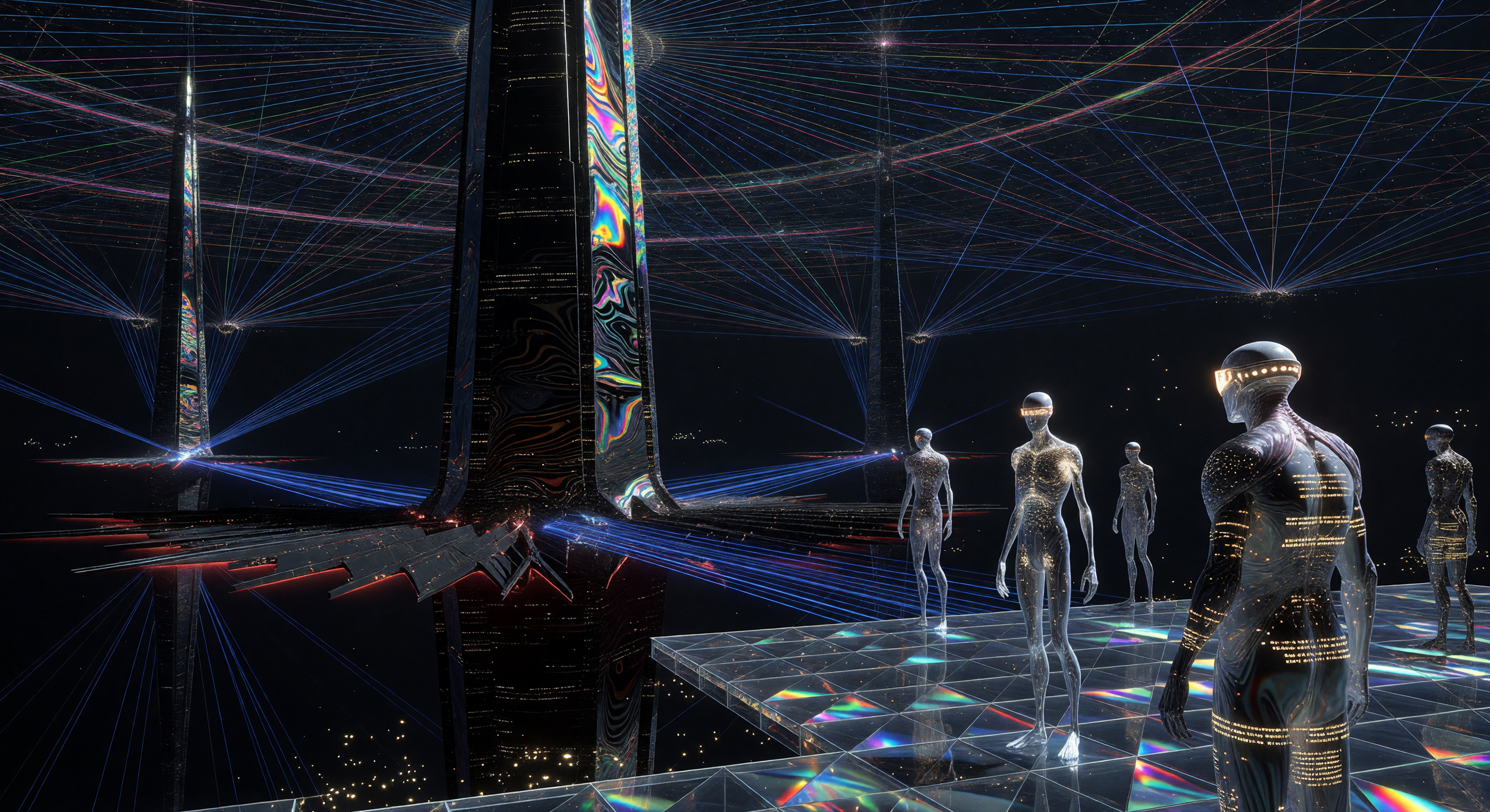 The committee agrees that the image broadly matches a far-future, post-biological megastructure scene: towering spires, a cantilevered platform, humanoid avatar-like figures, and a dense network of laser-like communication lines all support the intended 'Awakened' aesthetic. The committee also agrees the terrace has a convincing prismatic/diamond-lattice quality and the figures plausibly read as polymorphic post-biological entities. However, the caption overreaches far beyond what the image can support, especially on material science, atmospheric placement, and thermodynamic claims.