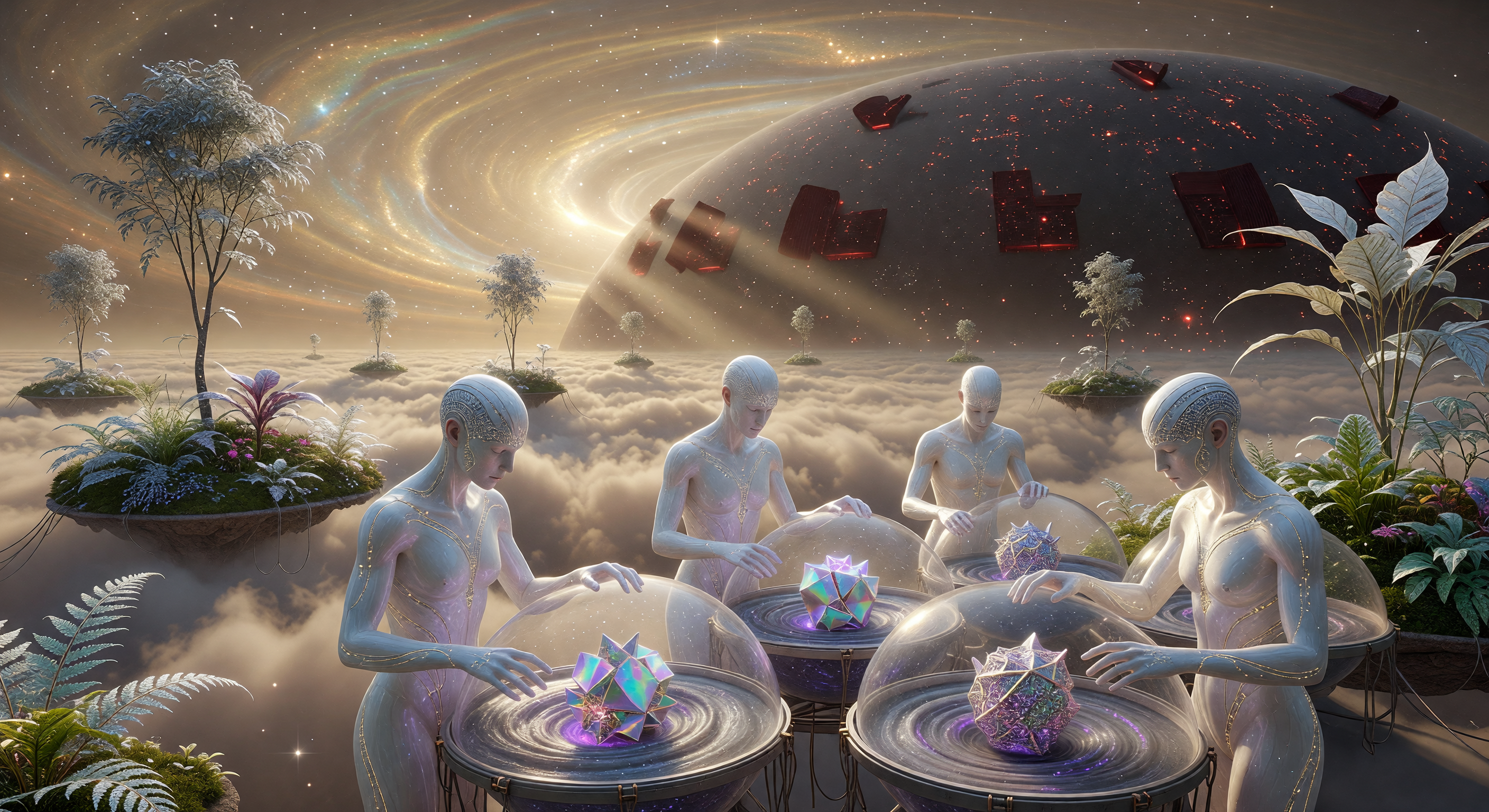 The image effectively captures a visually coherent and plausible far-future scene within an Aureole Habitat, with no anachronisms or historical inaccuracies given the speculative Horizon period (c. 100,000–1,000,000 CE) in the Awakened zone. The pale, translucent humanoid Polymorphic Avatars with subtle luminous markings and smooth, synthetic forms convincingly suggest 'liquid-state memory substrate' bodies, evoking programmable matter without literal depiction. Translucent assembly spheres containing glowing, faceted crystalline structures imply molecular synthesis processes, supported by the avatars' manipulative gestures. The engineered Neo-Boreal flora—silvery, ethereal trees and plants on floating islands—fits a post-biological ecology, while the massive dark hemispherical structure with red-glowing rectangular panels in the background aligns well with 'massive infrared fins' for waste heat radiation in a Kardashev Type 2.5 context. The swirling golden ring and misty 'Smart-Gas' atmosphere enhance the stellar-scale habitat feel, maintaining scientific plausibility for advanced nanotechnology and thermal management. Overall, visual coherence is strong, with no geology, biology, or tech elements clashing against the era.