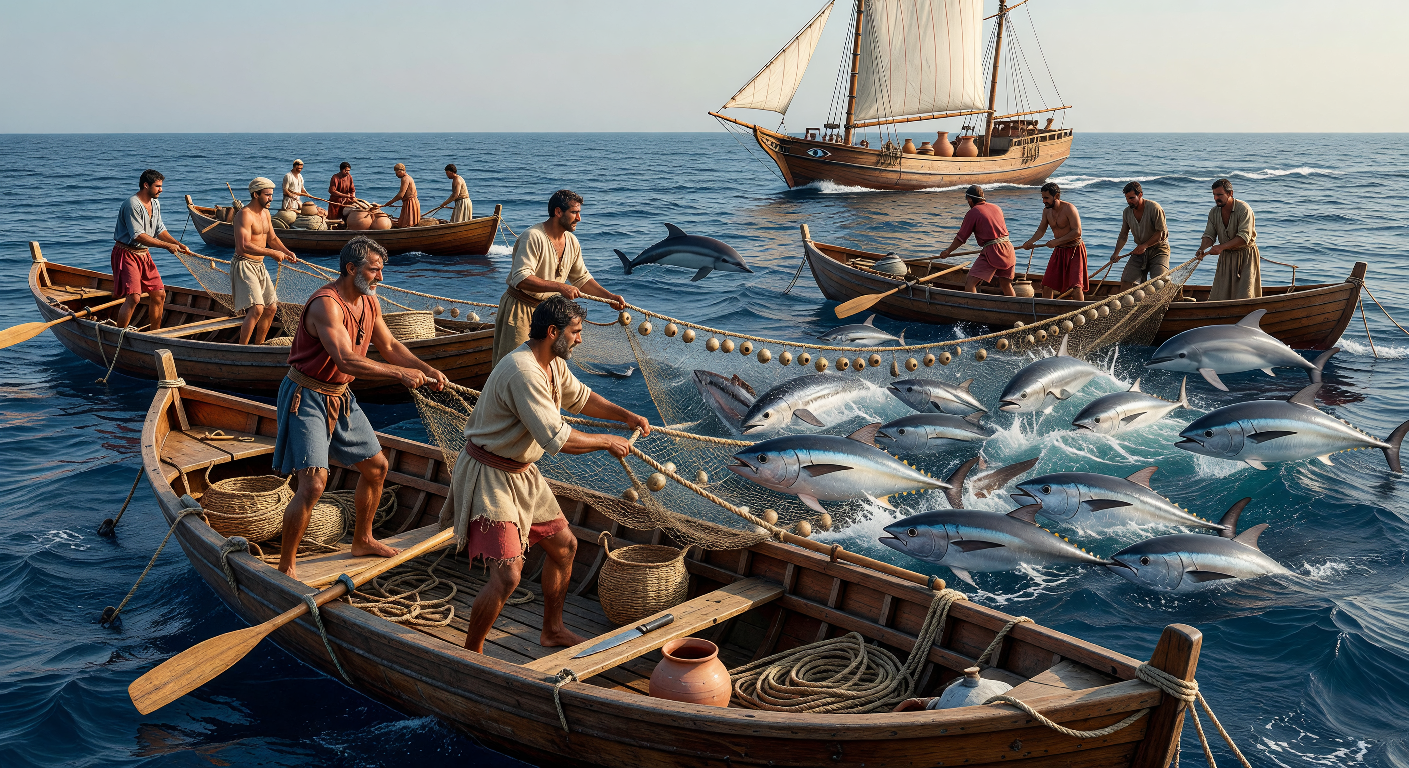 दक्षिणी इबेरिया के तट से दूर, लौह युग के मछुआरे संकरी लकड़ी की नावों में झुककर भारी जाल उफनती टूना मछलियों के झुंड पर फेंकते दिखाई देते हैं, जबकि पास ही डॉल्फ़िन लहरों को चीरती हुई झुंड को भीतर की ओर हाँक रही हैं। यह दृश्य ईसा पूर्व 6वीं–5वीं शताब्दी के जिब्राल्टर जलडमरूमध्य के पास का है, जहाँ फ़िनीकी और स्थानीय टार्टेस्सीय-इबेरियाई समुदाय मौसमी टूना प्रवास का लाभ उठाते थे। क्षितिज पर चौकोर पाल वाला चौड़े ढाँचे का फ़िनीकी व्यापारी जहाज़ इस बात की याद दिलाता है कि ये समृद्ध मत्स्य-क्षेत्र गादिर (आज का कादिस) से जुड़े व्यापक भूमध्यसागरीय व्यापार-जाल का हिस्सा थे, जहाँ नमकीन मछली, धातुएँ, रंग और अम्फ़ोरा में भरा माल दूर-दूर तक भेजा जाता था।