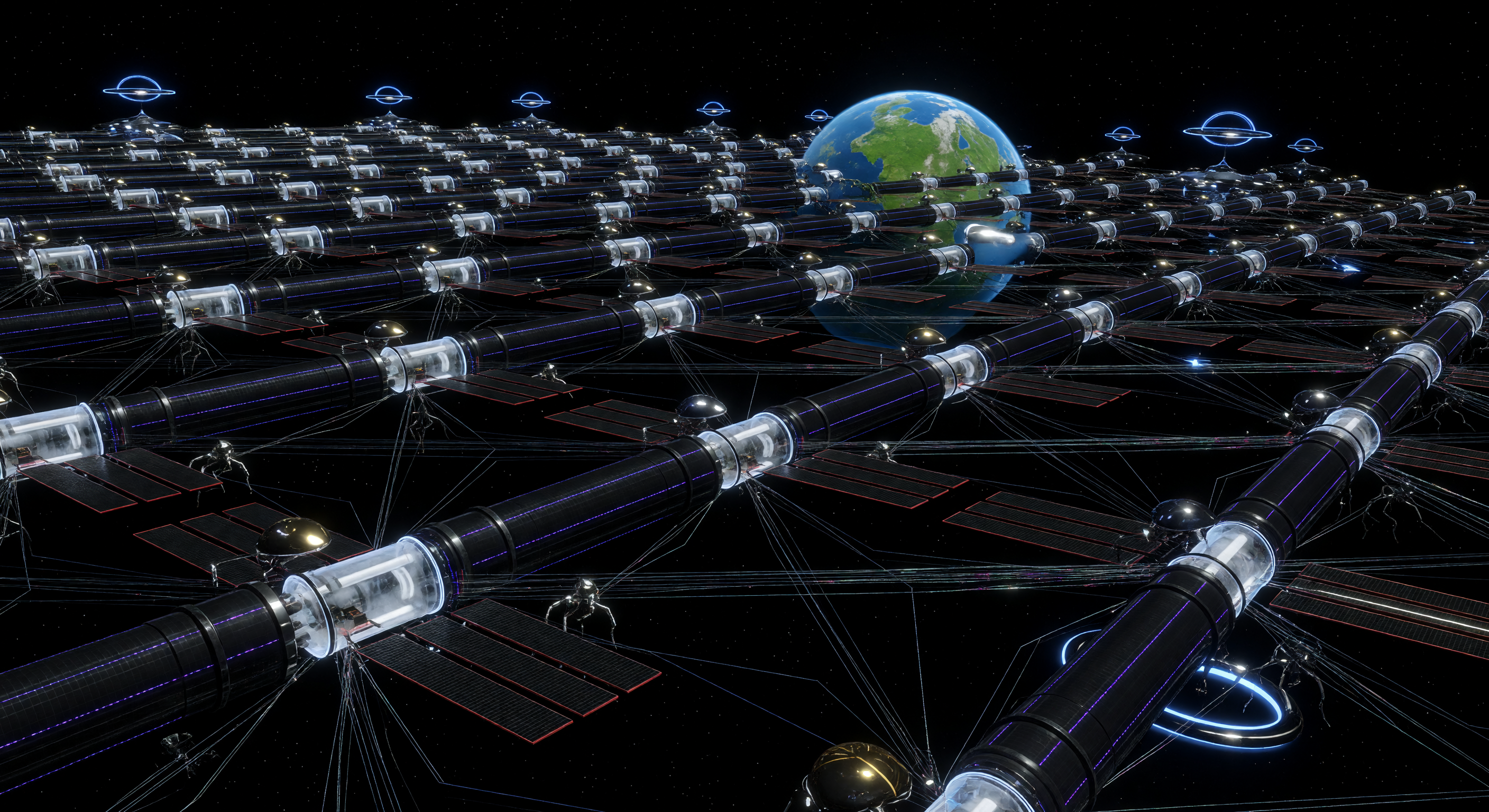 IMAGE: The image depicts a vast orbital lattice of cylindrical, glassy modules interconnected by glowing filaments against a black space backdrop, with a prominently lush green-and-blue Earth below, fitting the speculative 'Great Divergence' theme in Inventions & Technologies around 231 CE. Elements like modular nodes, solar-like panels, and nanotube-esque cabling are visually plausible for advanced orbital computing infrastructure, with no anachronisms (no archaic tech or clothing visible) and coherent scale/depth. The restored Earth landscape aligns thematically. Issues include prominent UFO-like ring halos (glowing circular auras around nodes) that appear decorative rather than functional, undermining scientific plausibility—they should be replaced with radiator fins, antennas, or thrusters. Glassy/transparent modules also evoke habitats more than cryogenic servers, slightly misaligning with cooling needs, but these are minor tweaks via prompt refinement.