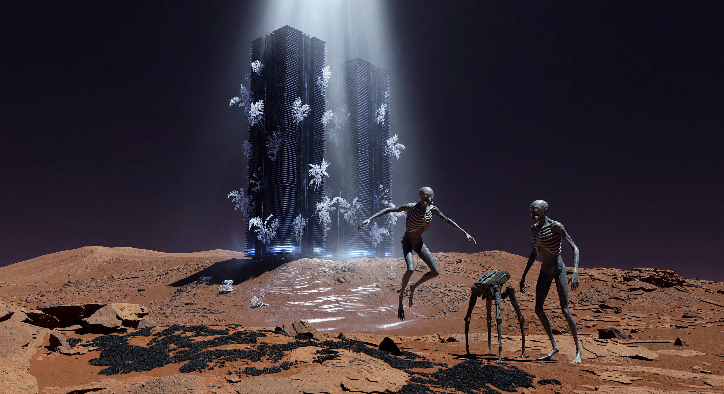 The image depicts a stark Martian landscape with reddish basaltic regolith and a dark sky, accurately evoking Olympus Mons' Tharsis plateau geology under low gravity (visible in elongated shadows and dust). The monolithic 'Cold Stacks' towers with glowing white accents and light beams plausibly represent futuristic quantum habitats leveraging cold high-altitude cooling, fitting a 220–250 CE 'Green Mars' divergence aesthetic. However, the humanoid figures are critically flawed: gaunt, skeletal aliens with exposed ribcages, elongated limbs, and no pressure suits or enclosures, which is scientifically implausible even for genetically adapted *Homo adaptus* in a 210-millibar atmosphere (far below human-breathable ~500+ mbar; they'd suffer ebullism and hypoxia). The white, palm-like crystalline structures read as fantasy bioluminescence rather than 'Iron-Lichen' or CO2 frost (which sublimates as vapor, not fronds), undermining ecological engineering visuals. A quadrupedal creature adds unmentioned fauna, risking visual incoherence. This requires full regenerate for suited adaptives, realistic low-g flora/frost, and plausible biology.