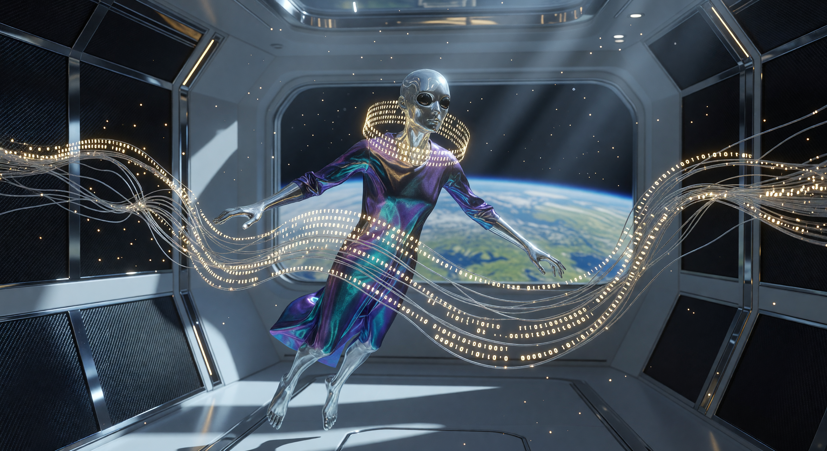 The committee agrees the scene is broadly successful at conveying a far-future orbital interior with a post-human, artistic aesthetic: the station setting, Earth visible through the window, floating microgravity pose, reflective silvery figure, iridescent garment, and luminous data-like ribbons all support the Great Divergence / Fashion, Arts & Culture concept. The committee also agrees the image is visually compelling and thematically close to the caption’s intended scene, but not fully aligned in several details.