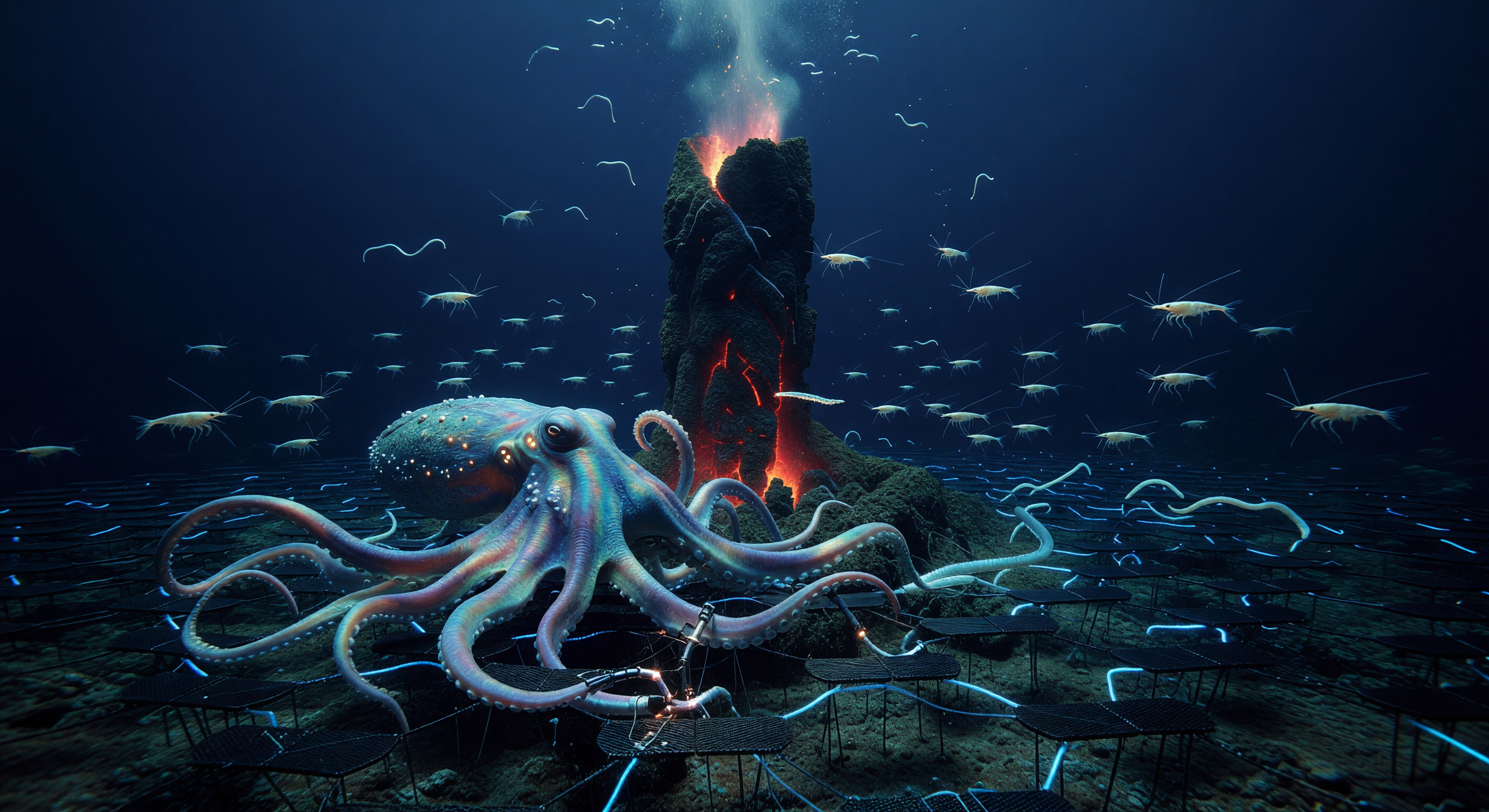 यूरोपा के समुद्र तल पर 100 किलोमीटर की गहराई में स्थित यह दृश्य एक विशाल हाइड्रोथर्मल 'ब्लैक स्मोकर' वेंट को दर्शाता है, जिसके चारों ओर पारभासी 'स्नो-श्रिंप' और तीन मीटर लंबे खंडित 'आइस-वॉर्म' जैसे चरमपंथी जीवों का जमावड़ा है। 'द ग्रेट डाइवर्जेंस' (2200–2500 ईस्वी) के इस कालखंड में, एक 15 मीटर लंबा जैव-संश्लेषित 'क्रैकेन' फ्रेम 400°C गर्म खनिज प्रवाह से ऊर्जा सोखने वाले थर्मोइलेक्ट्रिक एरेज़ का रखरखाव कर रहा है। बृहस्पति के इस रसातल में तकनीक और जीवविज्ञान का यह अनूठा संगम एक ऐसे पारिस्थितिकी तंत्र को उजागर करता है, जहाँ जीवन सूर्य के प्रकाश के बिना केवल भू-तापीय ऊष्मा और उन्नत इंजीनियरिंग के सहारे फल-फूल रहा है।