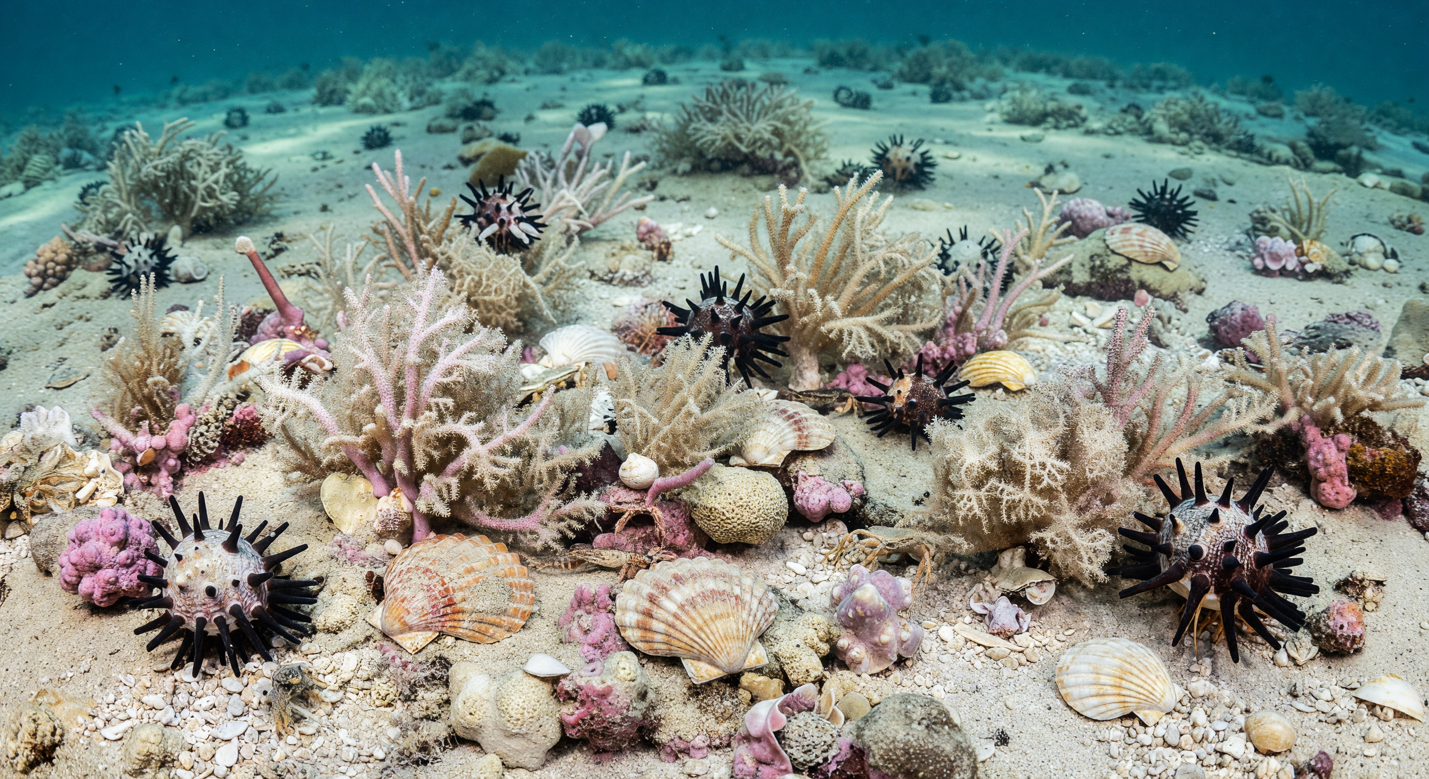 The image depicts a vibrant, shallow-water benthic scene with dense branching structures resembling gorgonians or branching corals (e.g., prominent pink and purple fan-like forms), black spiny urchins with long spines suggestive of modern diadematids or tropical cidaroids, scattered bivalve shells including scallops, and sandy shell-gravel substrate. While the substrate and general heterozoan elements (non-coral dominance) are plausible, the overall composition strongly evokes a modern tropical coral reef or temperate gorgonian assemblage rather than a late Eocene cool-temperate Australian shelf. Key inaccuracies include the abundance of brightly colored, high-relief branching growths that mimic antipatharians or alcyonaceans (rare or absent in Paleogene southern shelves), lack of delicate, lacy bryozoan colonies (fenestrate or encrusting forms typical of Celleporaria or Adeonellopsis), and insufficient emphasis on pink crustose coralline algae over gravel rather than erect branching algae. The urchins appear as thick-spined cidaroids in silhouette but are rendered too prominently tropical; crabs are barely discernible. No anachronistic human elements, but the visual coherence leans too 'reef-like' for clear, cool waters (e.g., excessive density and color saturation). This requires full regeneration with prompts specifying 'sparse delicate branching bryozoans, encrusting corallines on white shell hash, subdued lighting, no gorgonians or scleractinians.'