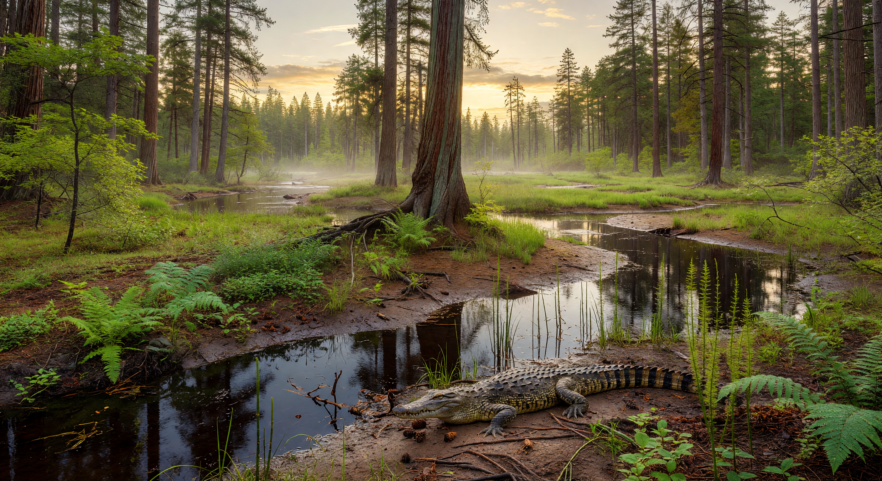 Image: The landscape (low, muddy channels, peaty-looking substrate, misty conditions, and a dense warm-temperate-to-subtropical forest) fits a Paleogene Arctic wetland conceptually. The flora shown (tall, conifer-like trunks with broad, ferny undergrowth) is broadly plausible for Early–mid Paleogene high-latitude forests. However, the dominant tree silhouettes resemble modern redwood/cypress forms but without clear Late Mesozoic/Cenozoic-specific morphological cues, and the overall look reads more like a generic temperate swamp forest than specifically an Arctic Eocene assemblage (e.g., no obvious taxonomic indicators in the foliage/seed cones). The crocodilian in the foreground is the biggest issue: the animal is rendered with modern crocodilian overall proportions and patterning, and no attempt is made to distinguish an Eocene crocodyliform comparable to Asiatosuchus (which would likely not be depicted as a near-identical modern-style reptile). Aside from that, there are no clear anachronisms like humans/technology.