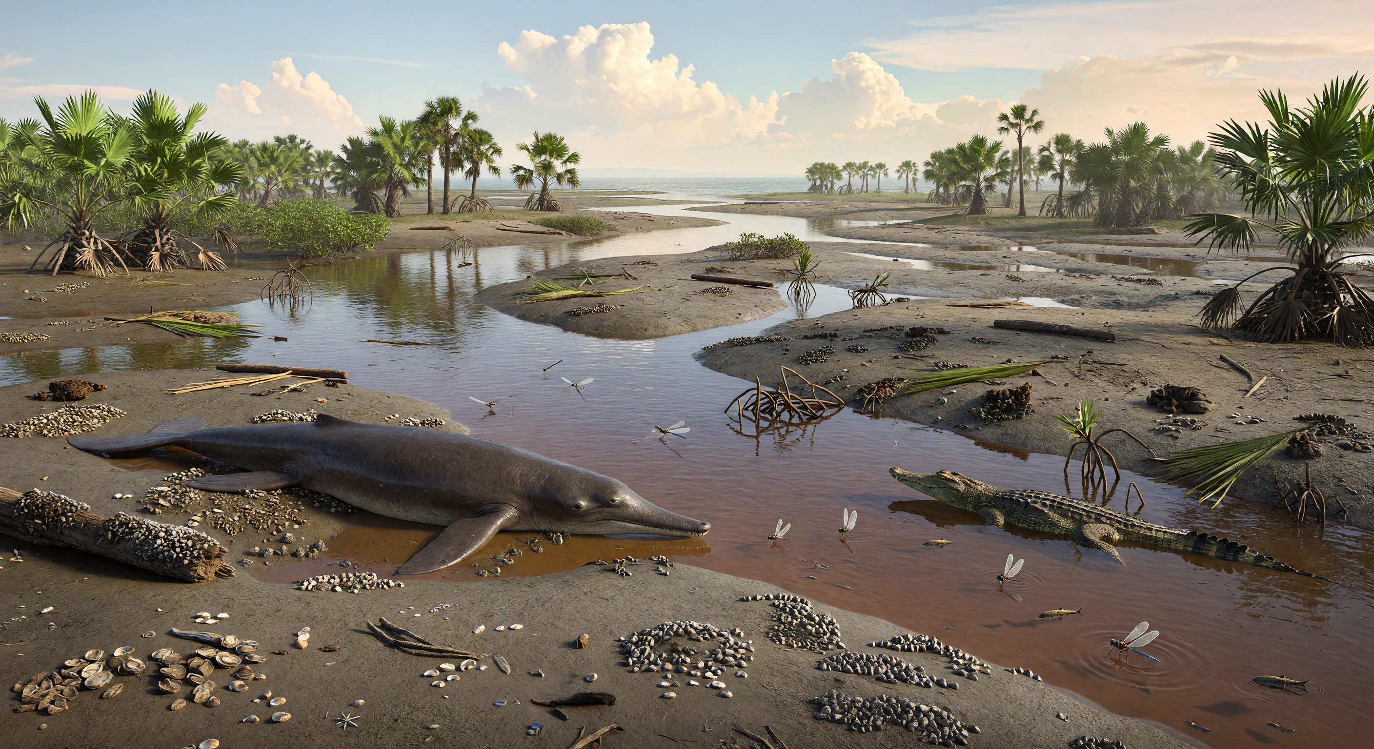 मध्य इओसीन, लगभग 4.7–4.3 करोड़ वर्ष पहले, टेथिस सागर के एक ज्वारीय मुहाने पर चाय-भूरे खारे पानी, कीचड़ भरे तटों और नाइपा (Nypa) पामों के झुरमुटों के बीच लगभग 3 मीटर लंबा प्रारम्भिक व्हेल Ambulocetus natans आधा डूबा घात लगाए पड़ा है। उसके पास Ostrea सीपों के घने गुच्छे कीचड़ में जमे हैं, जबकि जल की सतह पर व्याधपतंग मंडरा रहे हैं और किनारे की उथली धारा में एक लंबी थूथन वाला डाइरोसॉरिड क्रोकोडिलिफॉर्म गश्त कर रहा है। यह दृश्य उस समय को दर्शाता है जब व्हेल अभी पूरी तरह समुद्री नहीं बनी थीं—Ambulocetus जैसे स्तनधारी भूमि और जल, दोनों में चल-फिर सकते थे—और उष्ण, ग्रीनहाउस-जैसी दुनिया के मुहानों में शिकारी प्रतिस्पर्धा से भरे पारितंत्र पनप रहे थे।