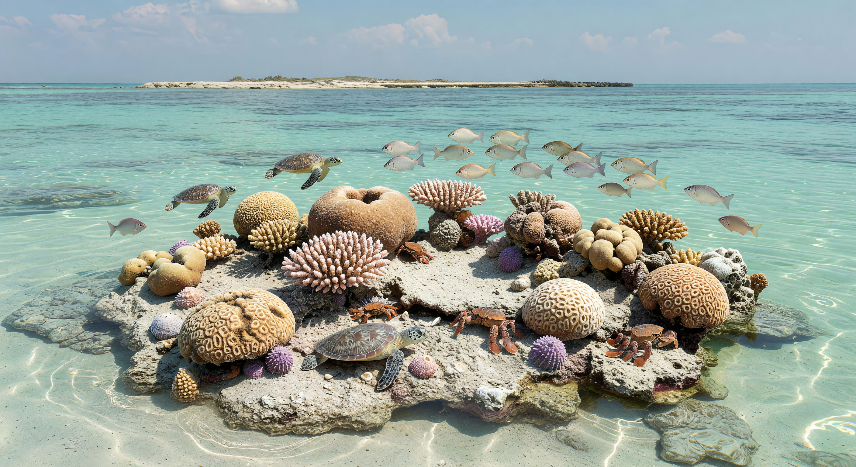 IMAGE issues identified by the committee: 1) The coral assemblage looks strongly modern and Caribbean/Indo-Pacific in overall aesthetic, with “brain-coral-like” masses, acroporid/stylophoran-looking branching forms, and other morphologies that are indistinguishable from a present-day reef. 2) The coral diversity appears overexuberant and modernized for an Eocene northern-Tethyan patch reef. 3) The fish school is generic modern reef-fish in silhouette rather than clearly Eocene-appropriate; it does not visibly support the caption’s taxon-level claim about Mene rhombea. 4) The sea turtles are plausible in broad terms but the shells/head profiles look stylized and modern, not clearly matching Eocene chelonian morphology. 5) The crabs and echinoids are plausible, but their styling also reads as modern reef fauna rather than Paleogene forms. 6) The reef-flat surface is partly exposed above water, which may be acceptable for a very shallow setting but conflicts somewhat with the caption’s emphasis on a submerged shallow-water reef community. 7) The background reef/islet and overall scene are geologically fine, but the composition visually suggests a present-day tropical reef more than a distinct Eocene assemblage.