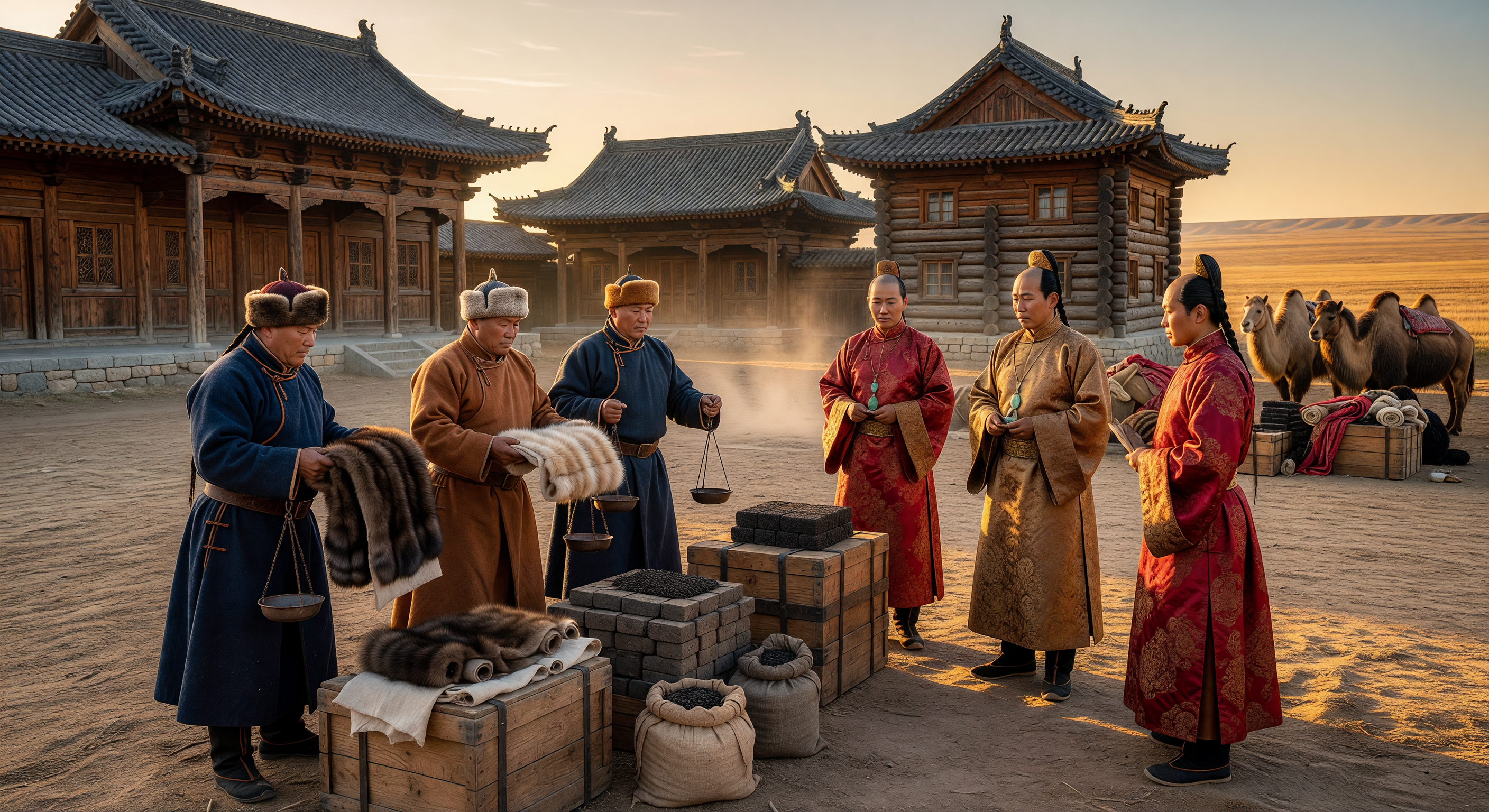 The image captures a visually coherent steppe trade scene with accurate elements like stacked brick tea, sable fur pelts, Bactrian camels, balance scales, and a hazy golden-hour atmosphere fitting the Mongolian steppe near Kyakhta. The hybrid architecture—Siberian-style log cabins with upturned Chinese rooflines—plausibly evokes the cultural synthesis at this border post, and the arid plain landscape aligns with Northern Asia's geology and biology. However, significant issues prevent approval: all figures wear Mongolian/Buryat-style del (robes) and fur-trimmed hats, with no ethnic Russians visible in heavy wool kaftans or bearded Cossack/merchants as caption-specified; the Qing side appears ceremonial (silk robes, elaborate headgear) rather than practical frontier attire, and a woman among them is anomalous for 175 Kyakhta trade negotiations dominated by male officials and merchants. No overt anachronisms, but the lack of distinct Russian identity undermines location-specific accuracy.