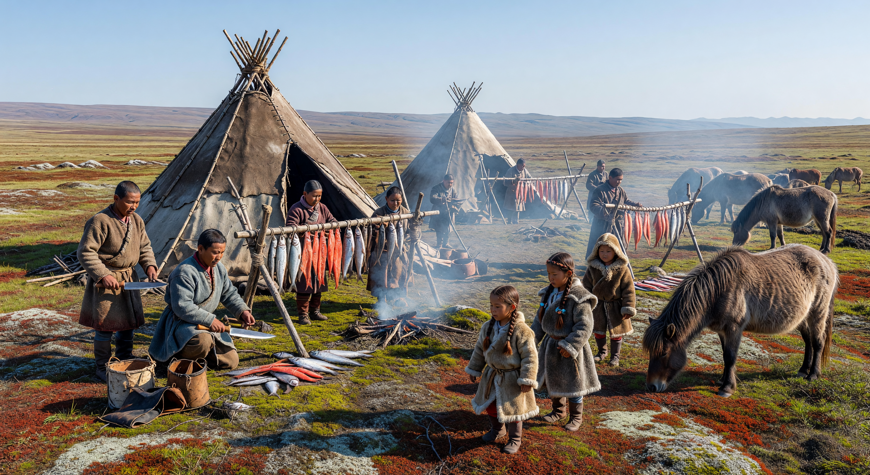The committee agrees that the scene successfully conveys a Siberian northern nomadic summer camp: conical chum-style tents, fish drying racks, smudge fires/smoke, tundra-like ground cover, and generally plausible fur/hide clothing all support the broad Evenk/Tungusic seasonal-lifeways concept. The environment and subsistence activities are also broadly compatible with an 18th-century northern Asian setting.