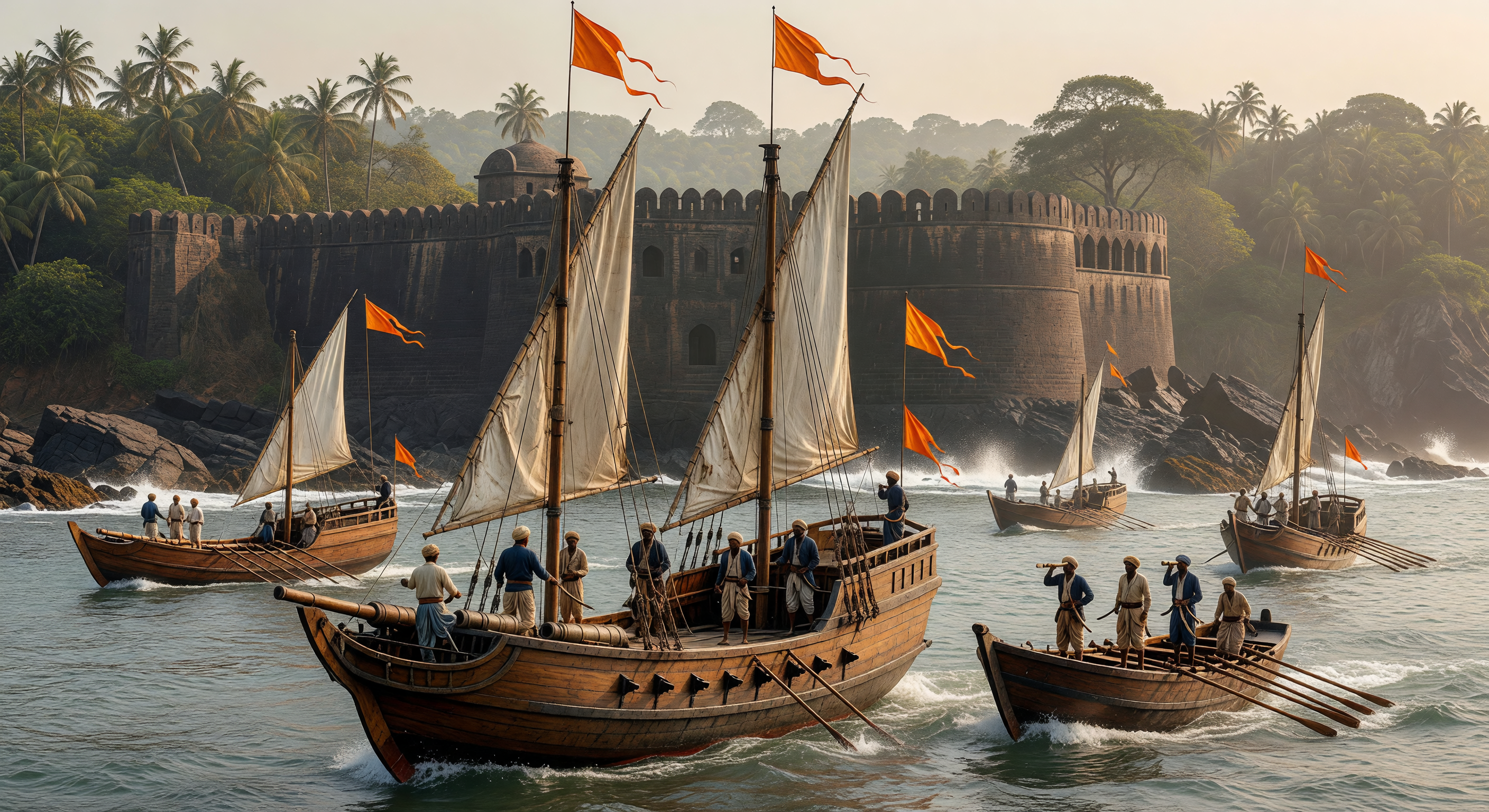 १८वीं शताब्दी के मध्य के इस दृश्य में मराठा नौसेना के शक्तिशाली 'गुराब' और 'गलिवात' जहाज कोंकण तट पर गश्त कर रहे हैं, जिनके केसरिया ध्वज समुद्री हवा में लहरा रहे हैं। पृष्ठभूमि में बेसाल्ट पत्थर से बना अभेद्य जंजीरा समुद्री किला दिखाई दे रहा है, जिसके पास से ये सागौन की लकड़ी से बने युद्धपोत अपनी भारी पीतल की तोपों के साथ गुजर रहे हैं। यह चित्र मराठा साम्राज्य की नौसैनिक कुशलता और पश्चिमी भारत के समुद्री व्यापार मार्गों पर उनके प्रभुत्व को स्थापित करने के ऐतिहासिक संघर्ष को जीवंत रूप में दर्शाता है।