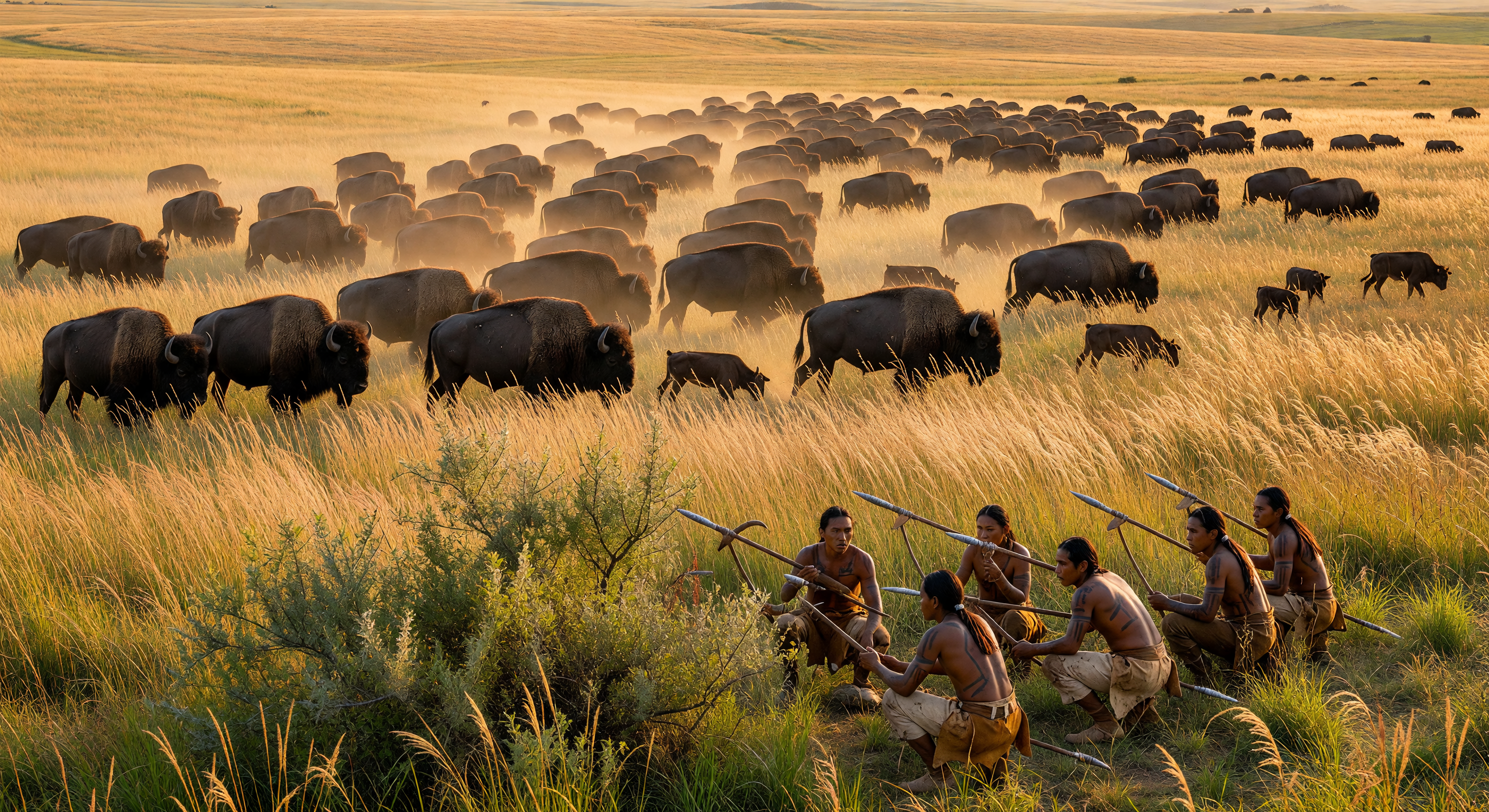 800 ईस्वी के आसपास उत्तरी अमेरिका के विशाल मैदानों में सूर्यास्त की सुनहरी रोशनी के बीच अमेरिकी बाइसन का एक विशाल झुंड चर रहा है। अग्रभूमि में, हिरण की खाल के पारंपरिक परिधान पहने शिकारी एटलैटल और चकमक पत्थर के भालों के साथ सावधानी से इस झुंड पर नज़र रख रहे हैं। यह दृश्य मिसिसिपियन संस्कृति के उदय के दौरान स्वदेशी लोगों और प्रकृति के गहरे संबंध तथा घोड़ों के आगमन से पूर्व की उनकी परिष्कृत शिकार तकनीकों को जीवंत करता है।