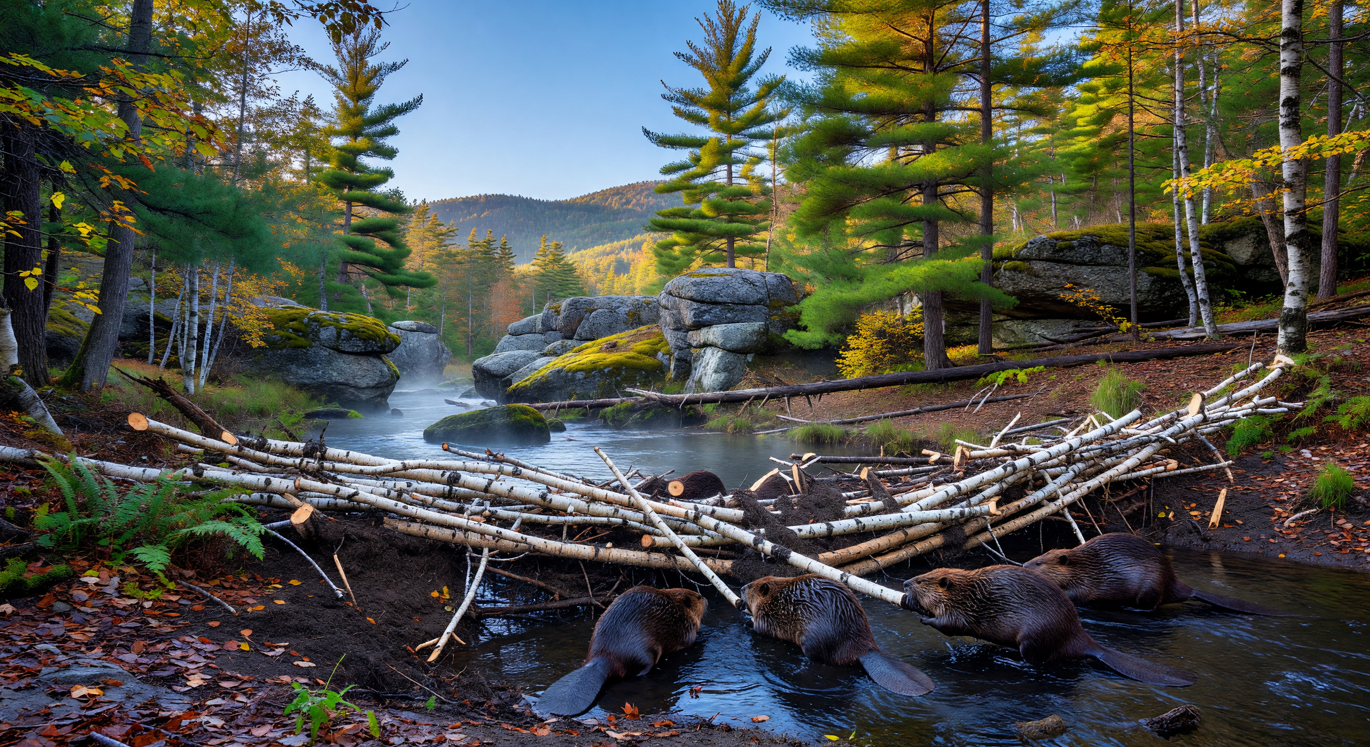 The image is visually coherent and scientifically plausible for North American beavers (*Castor canadensis*) constructing a dam in a northeastern forest setting. The beavers are accurately depicted in morphology and behavior, actively placing branches in a stream with mud incorporation visible, surrounded by felled logs and riparian vegetation. The landscape features appropriate Laurentian/Canadian Shield elements like granite outcrops, a mix of conifers (white pines, likely eastern white pines *Pinus strobus*), birches (*Betula* spp.), and hardwoods in autumn foliage, consistent with early 17th-century Northeast woodlands. No anachronisms are present—no human elements, clothing, architecture, or technology appear, which fits a wilderness scene. The dam structure, while somewhat idealized, shows realistic stick piling and water impoundment without major inaccuracies. Ecologically, this matches beaver-modified wetlands in the region during the Renaissance period (early 160s), with no cultural or historical mismatches since humans are absent as per the focus.