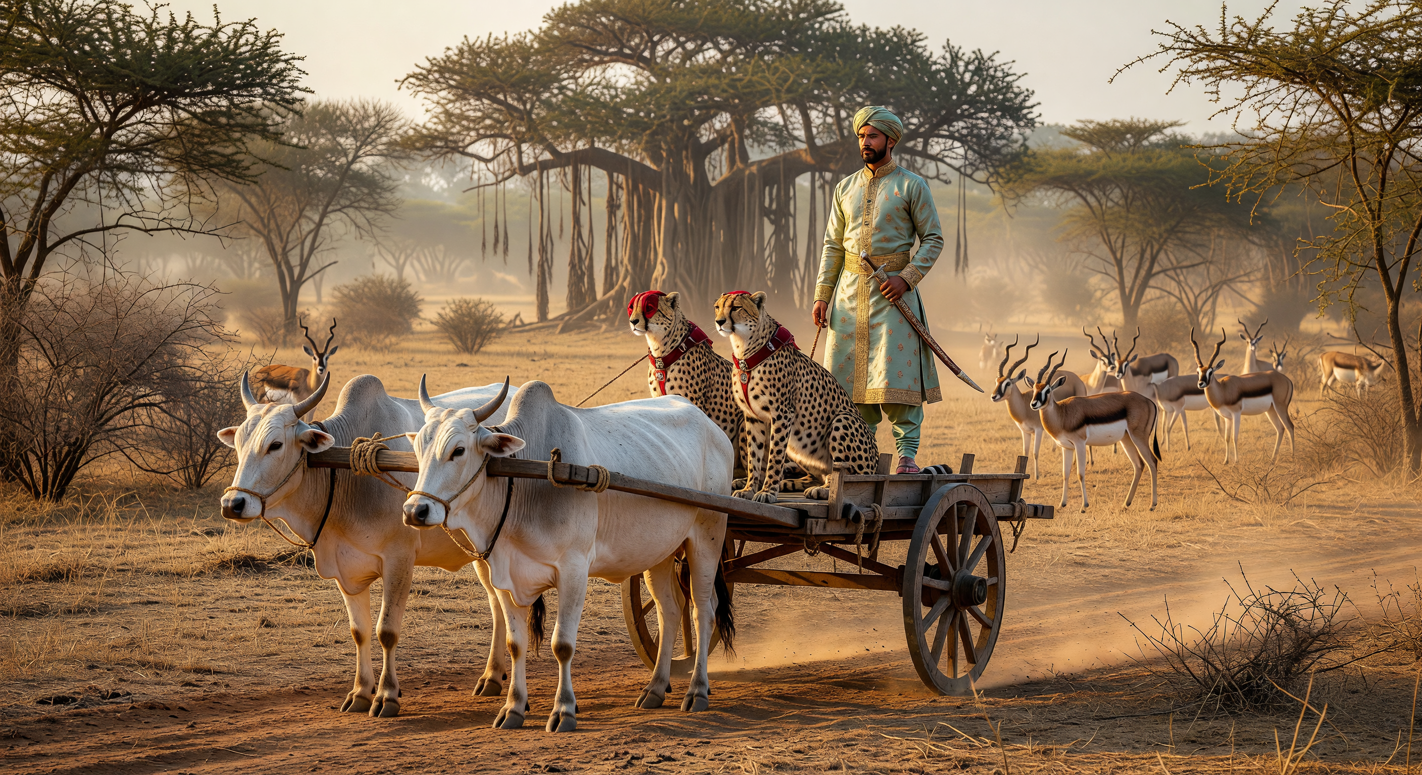 Paragraph 1: The committee broadly agrees that the scene successfully evokes Mughal-era South Asia: a nobleman in period-like attire stands on a bullock-drawn cart in a dry scrubland with acacia/banyan-like trees, and the use of cheetahs for a royal hunt is historically plausible for Mughal shikar. Several reviewers also agreed that the overall composition, animal handling concept, and elite courtly styling are generally on-theme.