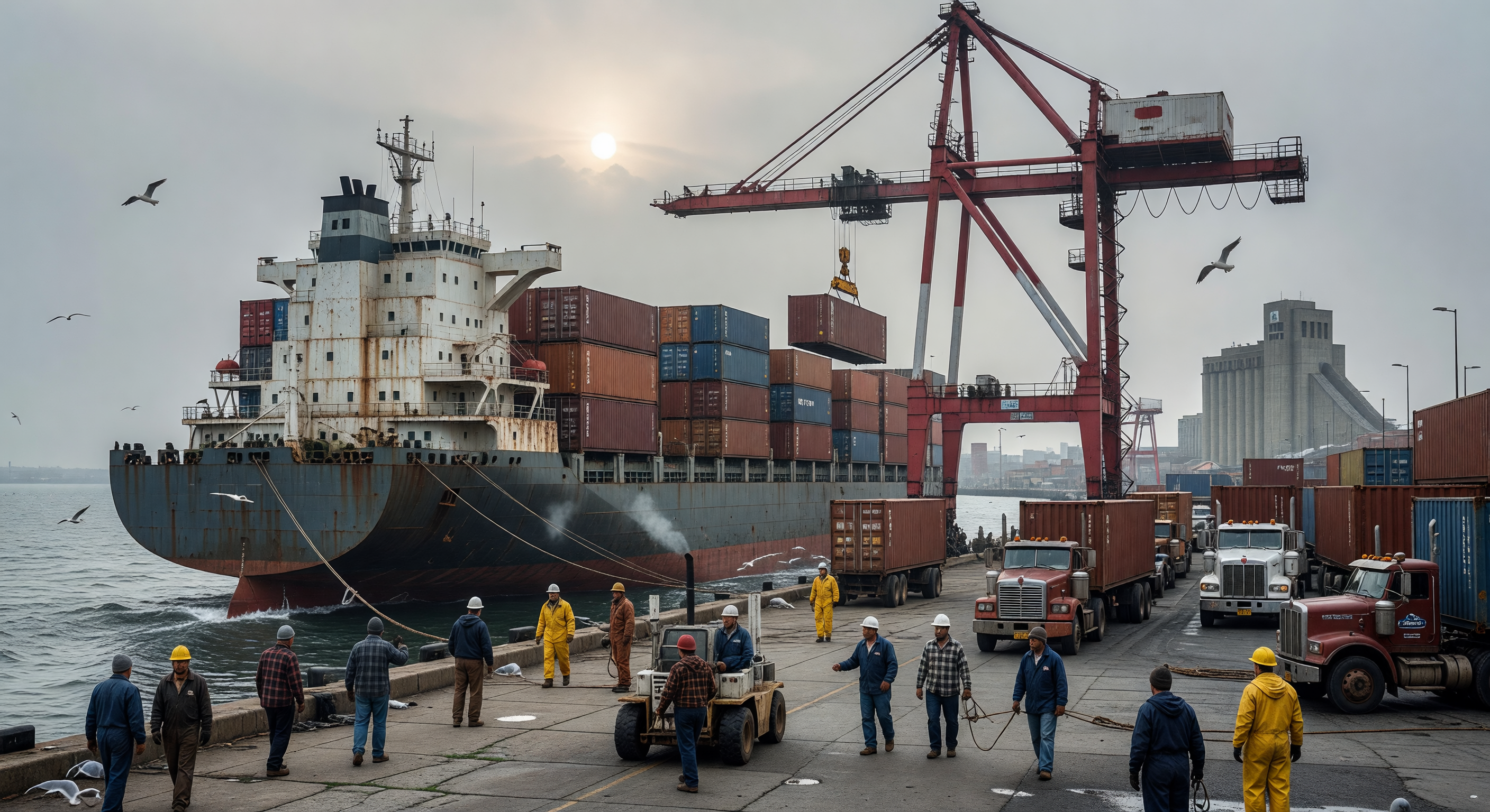 The image presents a broadly convincing late 1970s port scene with several strong elements: the all-aft superstructure container ship with period-appropriate rust and weathering, workers in plaid flannel shirts and heavy-duty workwear with hard hats, the overcast industrial atmosphere, and grain elevators visible in the background (which are indeed characteristic of the Port of Montreal). The seagulls and general ambiance of a Saint Lawrence River port are well-captured. However, there are some concerns. The container stacking on the ship appears quite high and dense — more consistent with 1980s-90s operations than the late 1970s, when container volumes at Montreal were still relatively modest. The gantry crane depicted looks more modern than what would have been typical at Montreal in the late 1970s; Montreal's Racine Terminal was still being developed for container operations at that time. Some of the trucks on the right side appear to have styling more consistent with the 1980s-90s rather than the late 1970s. The sheer number of containers stacked on the quayside also suggests a more mature containerized operation than what Montreal had in the late 1970s.