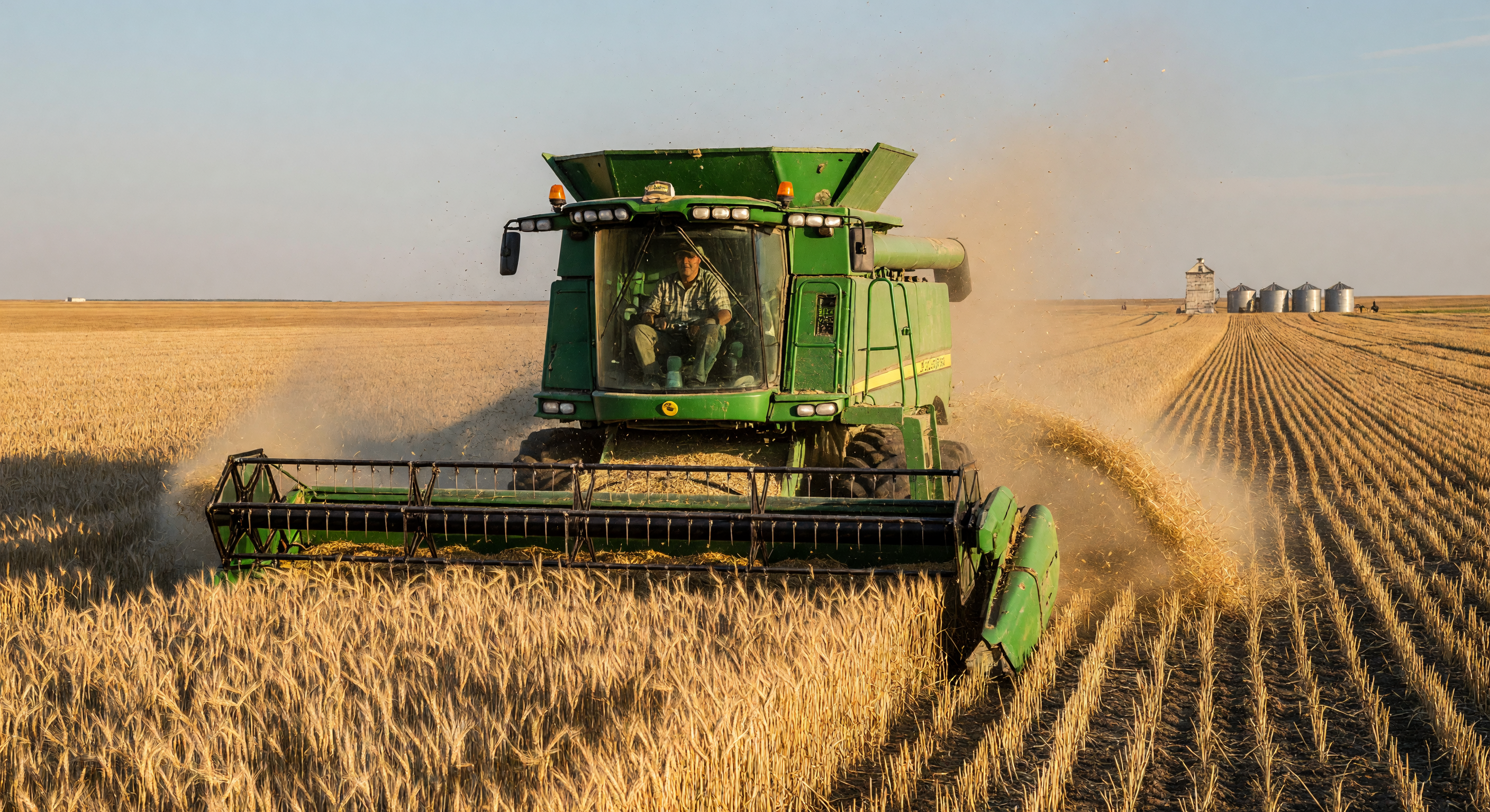 कैप्शन संदर्भ में तथ्यात्मक रूप से मजबूत है: सस्काचेवान की हार्ड रेड स्प्रिंग विगत के उत्पादन में भूमिका, एकल फसल का बूम, और 199 के दशक के ग्रामीण परिवर्तन सटीक हैं, 'बिग स्काई' प्रैरी प्रतीकवाद को उकेरता है। हालाँकि, जॉन डियर 960 मैक्सिमाइज़र 1996 में पेश किया गया था, 1994 की फसल के लिए उपलब्ध नहीं था - इससे स्पष्ट अनाक्रोनिज्म बनता है (पिछले 900 श्रृंखला बेहतर फिट होते हैं)। 'लकड़ी के अनाज लिफ्ट' का दावा चित्र की प्रमुखता से धातु/सफेद संरचनाओं के साथ मेल नहीं खाता (लंबा एक पेंटेड लकड़ी के रूप में पास हो सकता है, लेकिन निकटवर्ती बिन आधुनिक स्टील हैं, जो 198 के बाद आम हैं लेकिन 'लकड़ी के नहीं')। '20 वीं सदी के अंत में औद्योगिक कृषि बूम का शिखर' विषयात्मक है - प्रैरी की तीव्रता 200 के दशक में बाद में चरम पर थी - लेकिन यह बुरी तरह गलत नहीं है। आवश्यक समायोजन: मॉडल/वर्ष को सही करें या सामान्यीकृत करें, लिफ्ट के विवरण को चित्र के साथ मिलाएं।